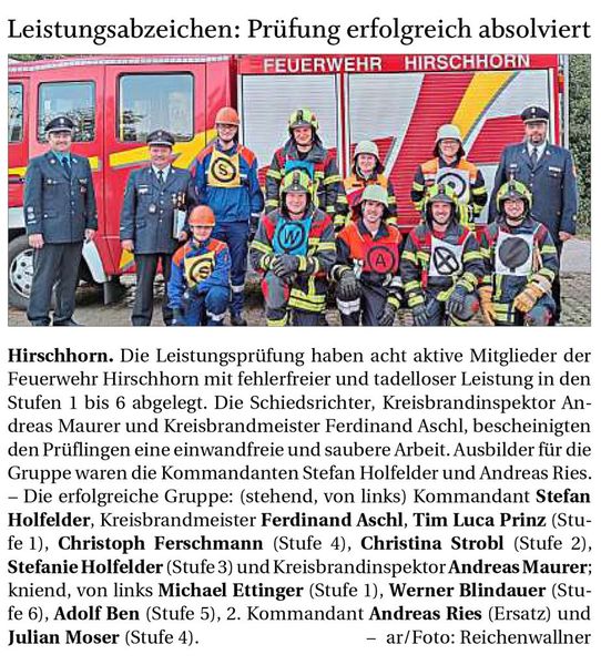 Die Kreisbrandinspektion des Landkreises Rottal-Inn entsandte die zwei Schiedsrichter Kreisbrandinspektor Andreas Maurer und Kreisbrandmeister Ferdinand Aschl nach Hirschhorn um die Prüfung abzunehmen.