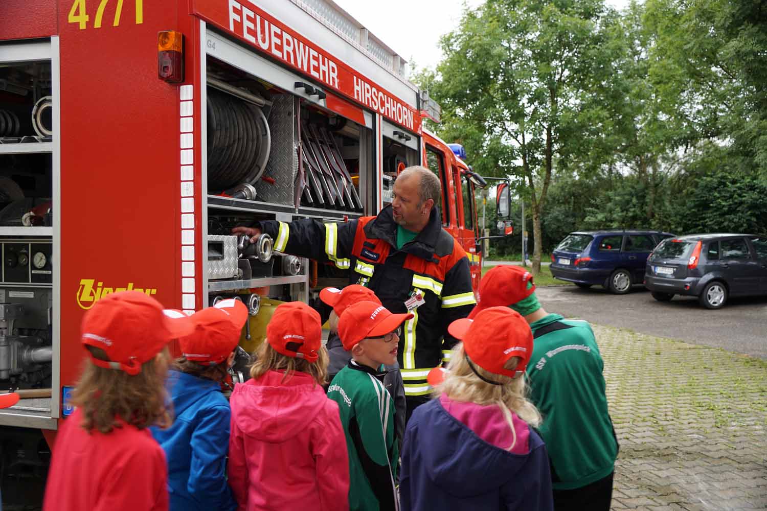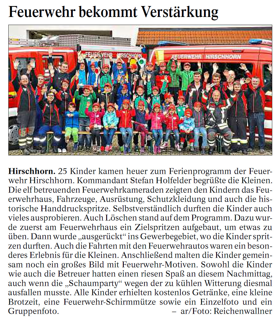 25 Kinder kamen heuer zum Ferienprogramm der Feuerwehr Hirschhorn. Kommandant Stefan Holfelder begrüßte die Kleinen und gab ihnen einen Überblick darüber, was sie heute alles erwarten wird. Dann wurden die Kinder in mehrere Gruppen aufgeteilt und los ging es.