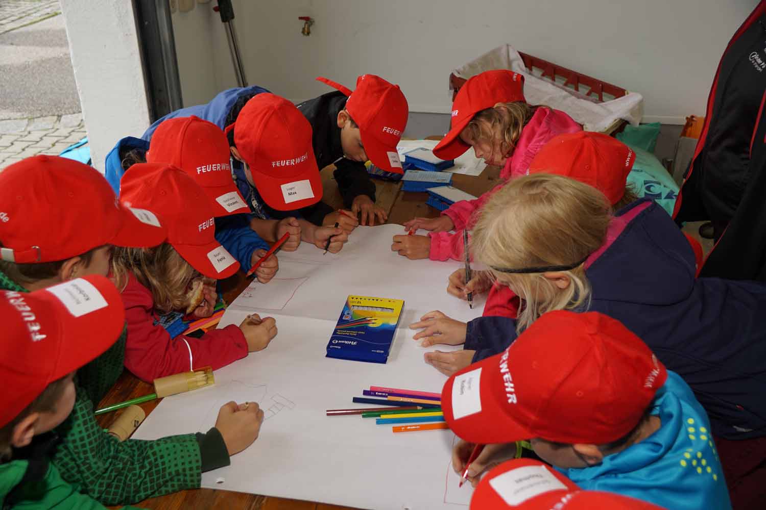 Anschließend malten die Kinder gemeinsam noch ein großes Bild mit Feuerwehrmotiven, die sie heute kennengelernt hatten. Sowohl die Kinder wie auch die Betreuer hatten einen riesen Spaß an diesem lustigen Nachmittag, auch wenn die obligatorische „Schaumparty“ wegen zu kühler Witterung ausfallen musste.