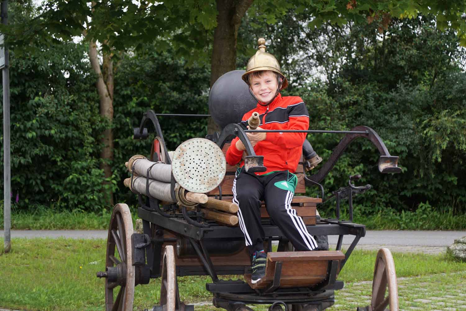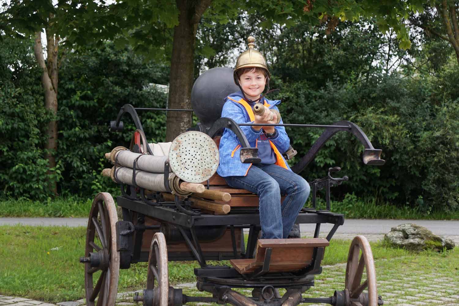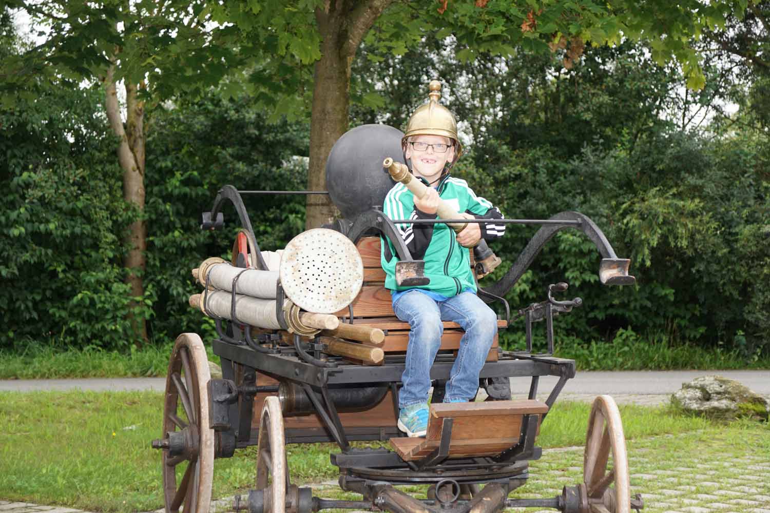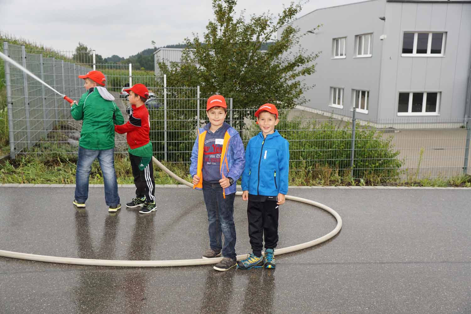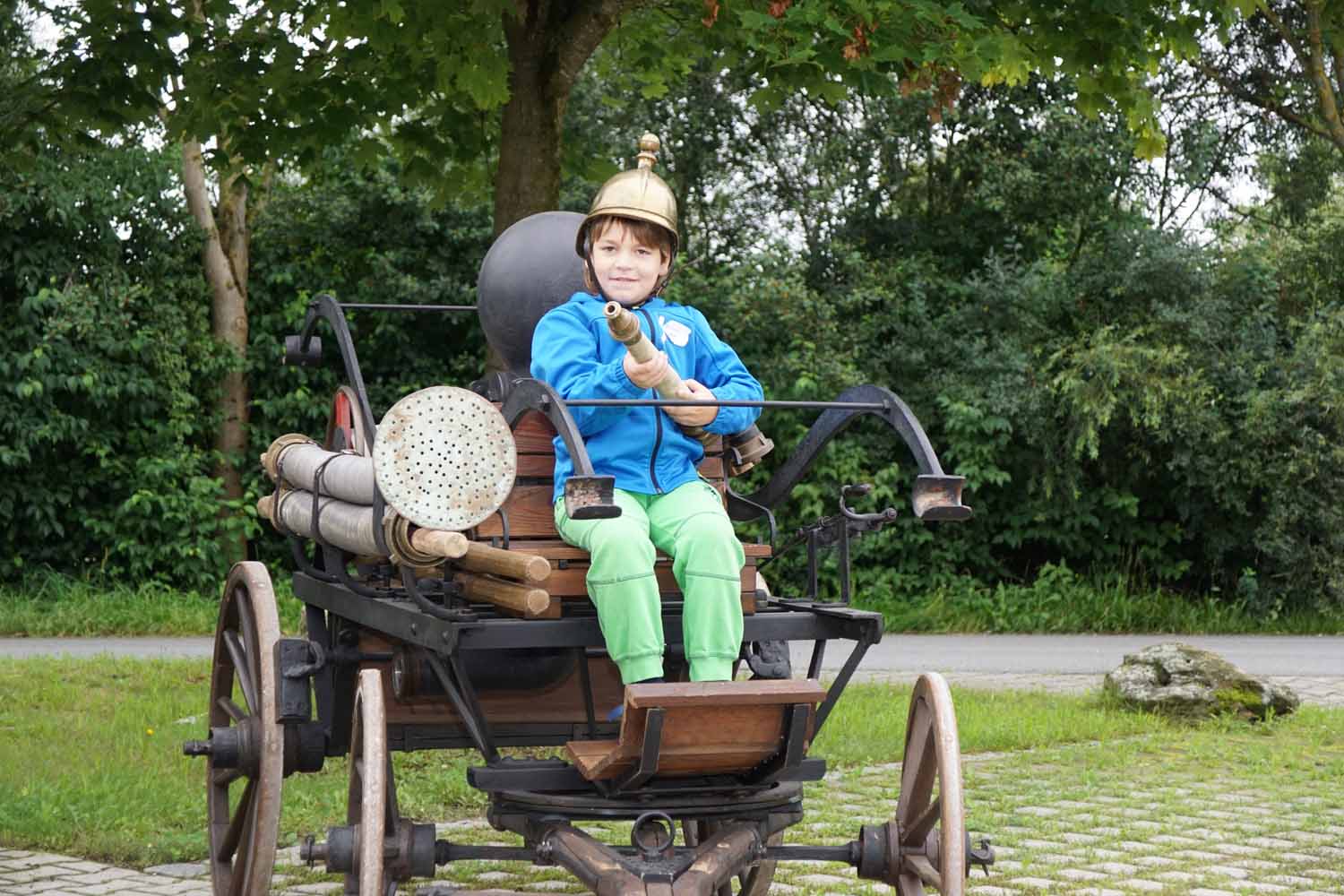 Unsere Feuerwehrkameraden zeigten den Kids das Feuerwehrhaus, die Feuerwehrautos, die technische Ausrüstung, die Schutzausrüstung, die historische Handdruckspritze, usw. Natürlich durften die Kinder auch vieles anfassen und ausprobieren. Doch dann wollten sie endlich mal so richtig löschen. Dazu wurde zuerst am Feuerwehrhaus ein Zielspritzen aufgebaut um etwas zu üben. Dann wurde „ausgerückt“ ins Gewerbegebiet, wo die Kinder mal so richtig spritzen durften. Natürlich waren auch die Fahrten mit den Feuerwehrautos ein Highlight für die Kleinen.