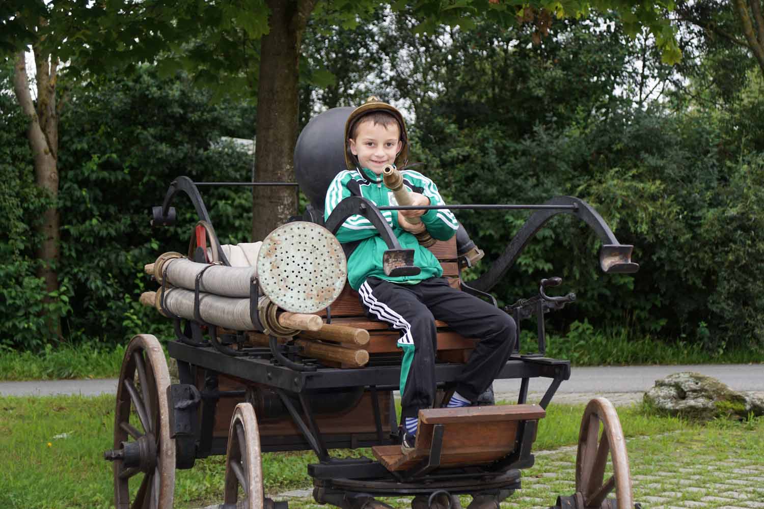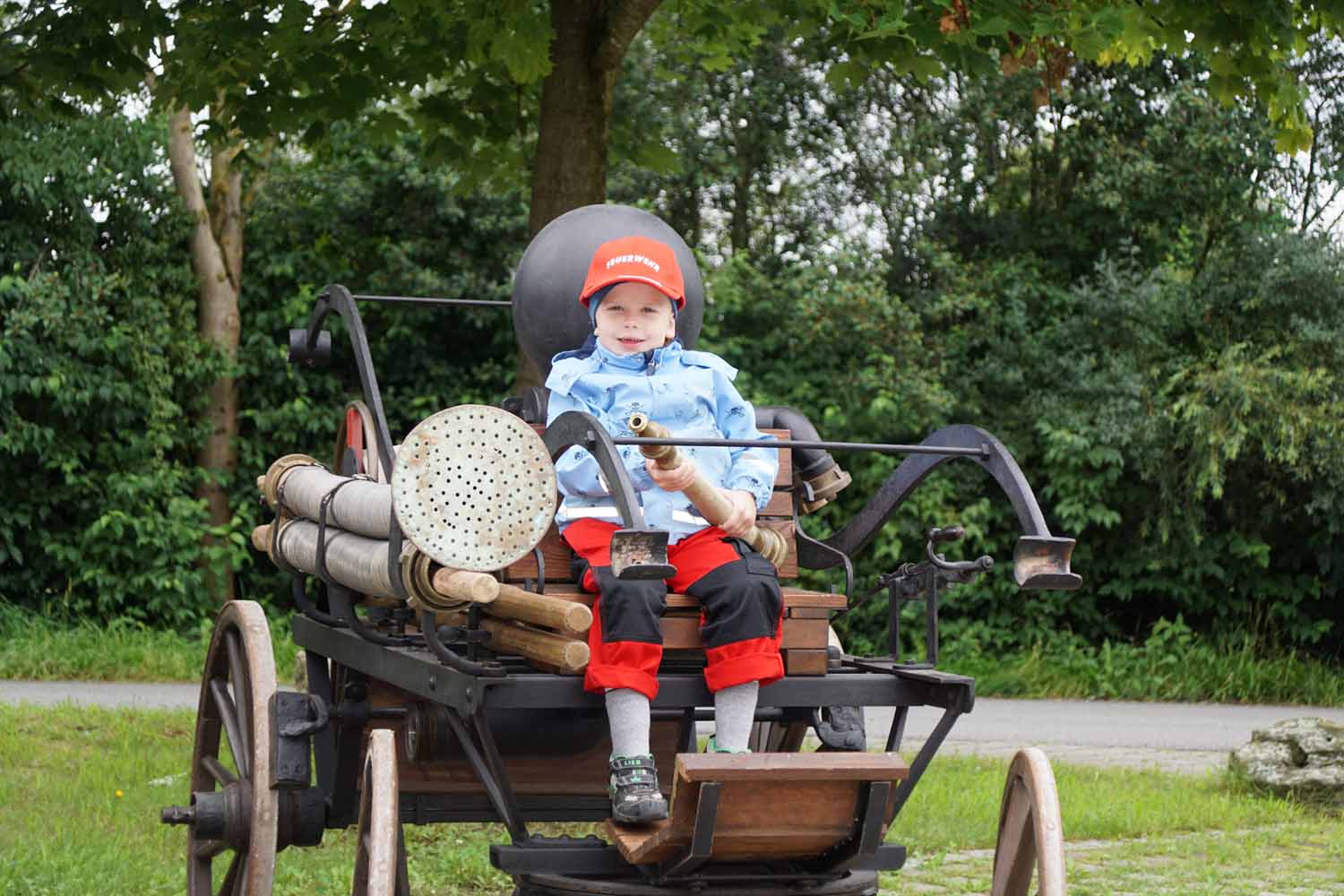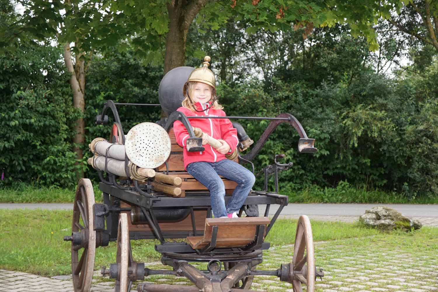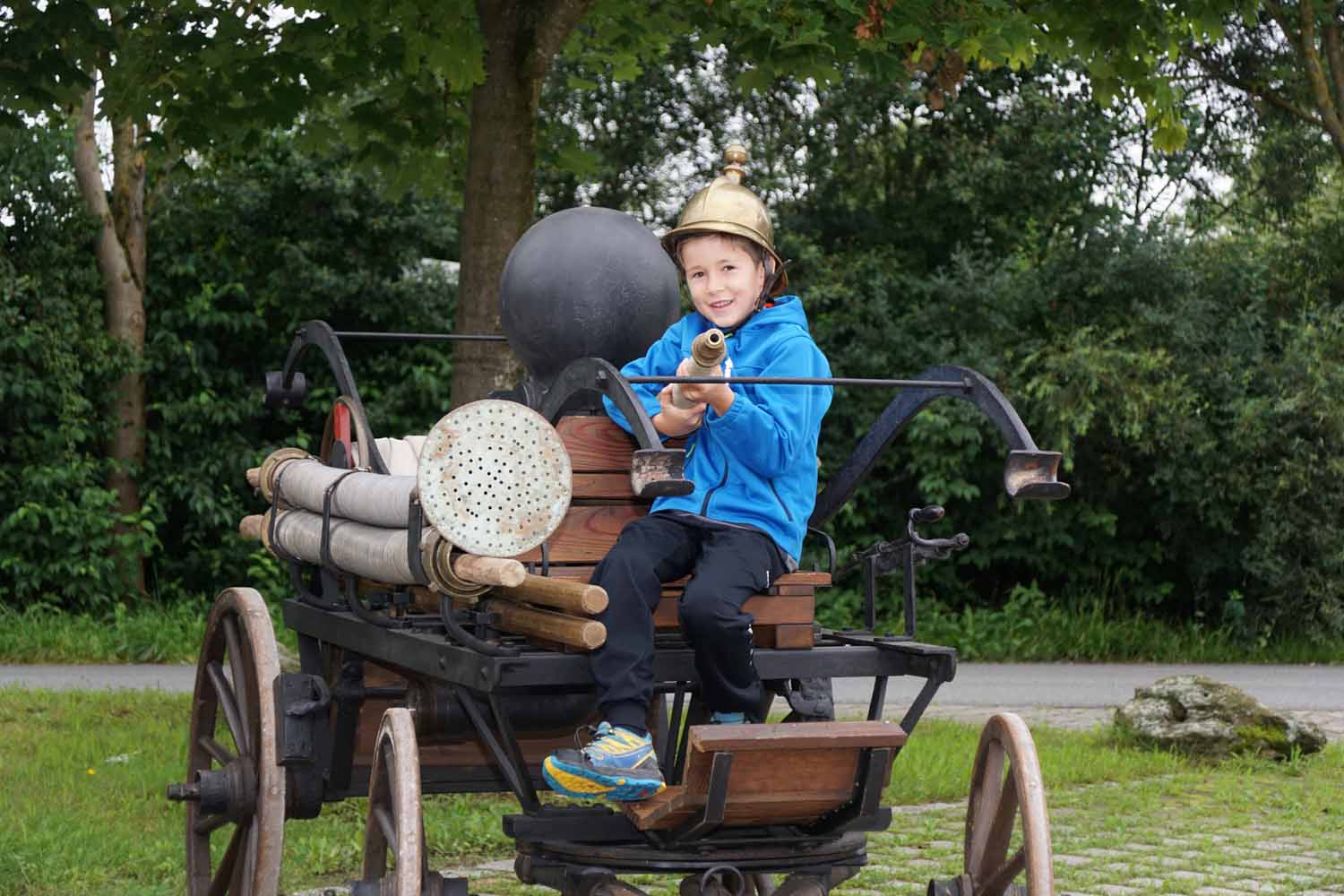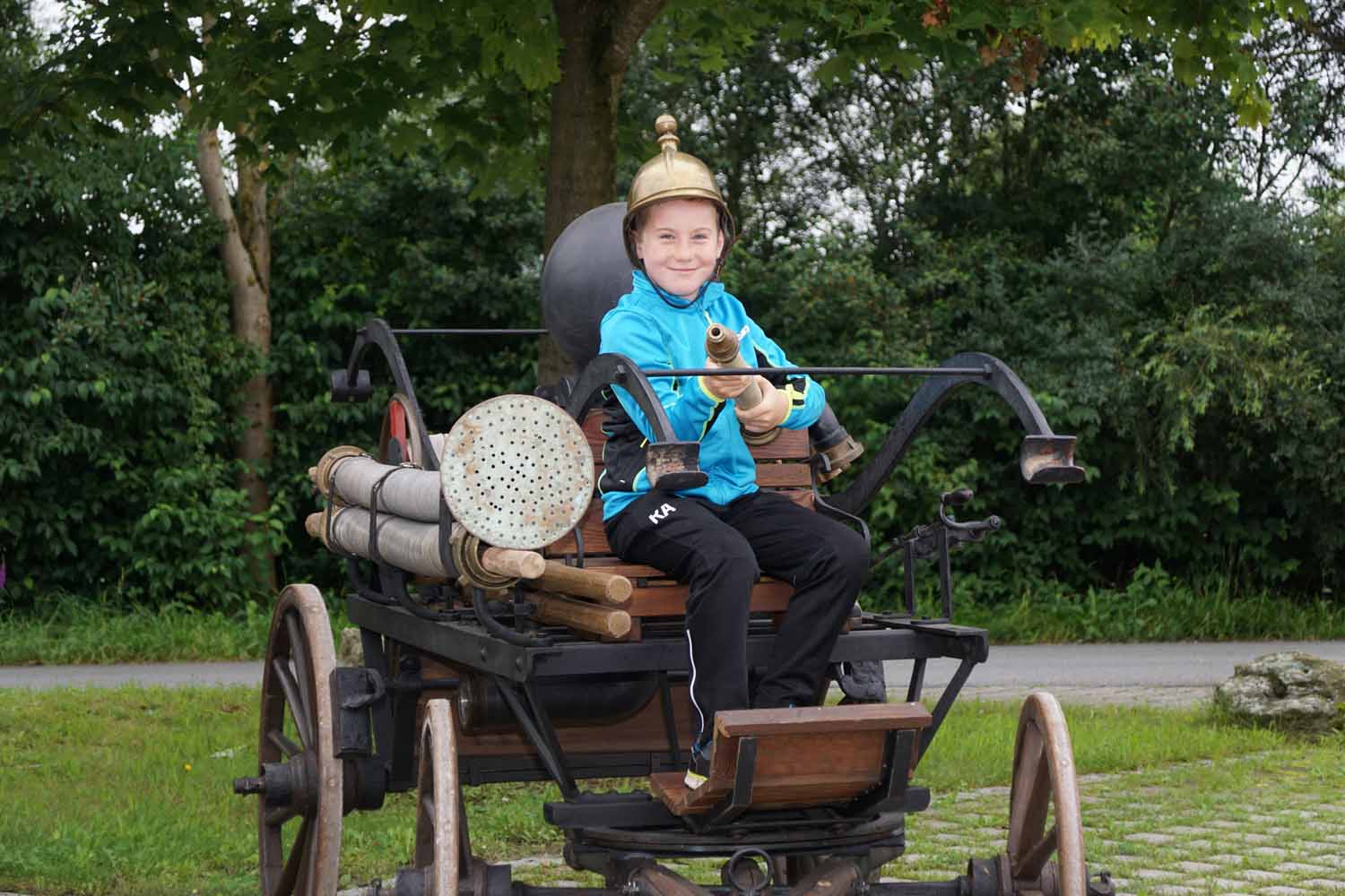 Unsere Feuerwehrkameraden zeigten den Kids das Feuerwehrhaus, die Feuerwehrautos, die technische Ausrüstung, die Schutzausrüstung, die historische Handdruckspritze, usw. Natürlich durften die Kinder auch vieles anfassen und ausprobieren. Doch dann wollten sie endlich mal so richtig löschen. Dazu wurde zuerst am Feuerwehrhaus ein Zielspritzen aufgebaut um etwas zu üben. Dann wurde „ausgerückt“ ins Gewerbegebiet, wo die Kinder mal so richtig spritzen durften. Natürlich waren auch die Fahrten mit den Feuerwehrautos ein Highlight für die Kleinen.