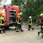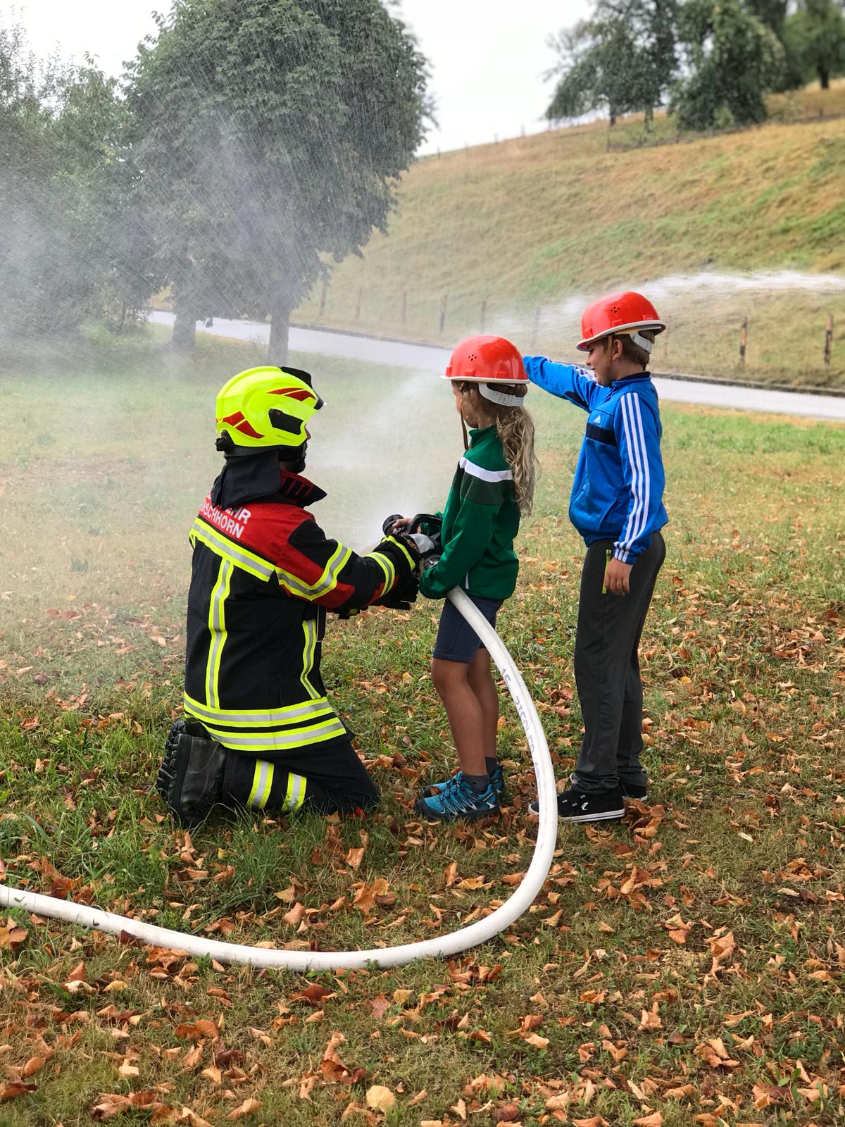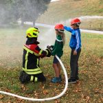 Dann wurde es spannend, bei einem Simulierten Einsatz zeigten die Kammeraden wie eine Wasserversorgung von einer Zisterne oder einem Hydranten zum Fahrzeug aufgebaut wird. Nun war es so weit die jungen Feuerwehrbegeisterten durften selbst, in Begleitung eines Feuerwehrmitglieds, mit Strahlrohren eine Wiese „löschen“ und einen vernebelten Raum mit der Wärmebildkammera durchsuchen.