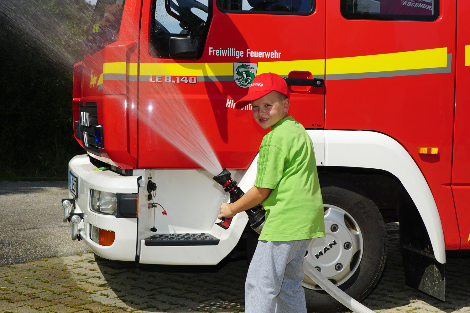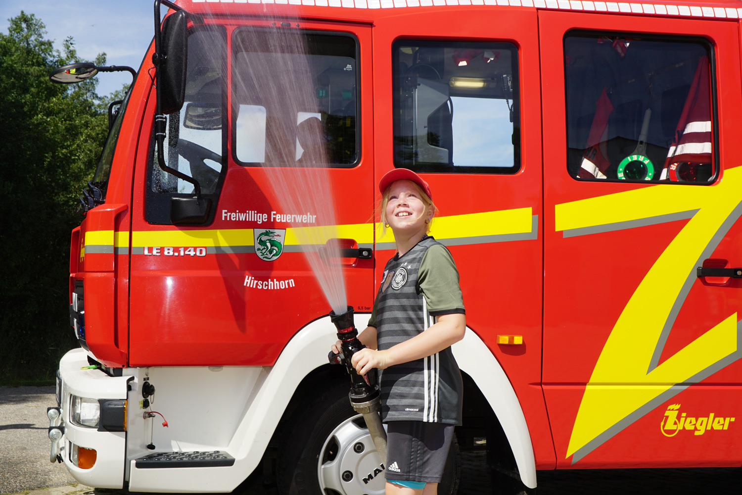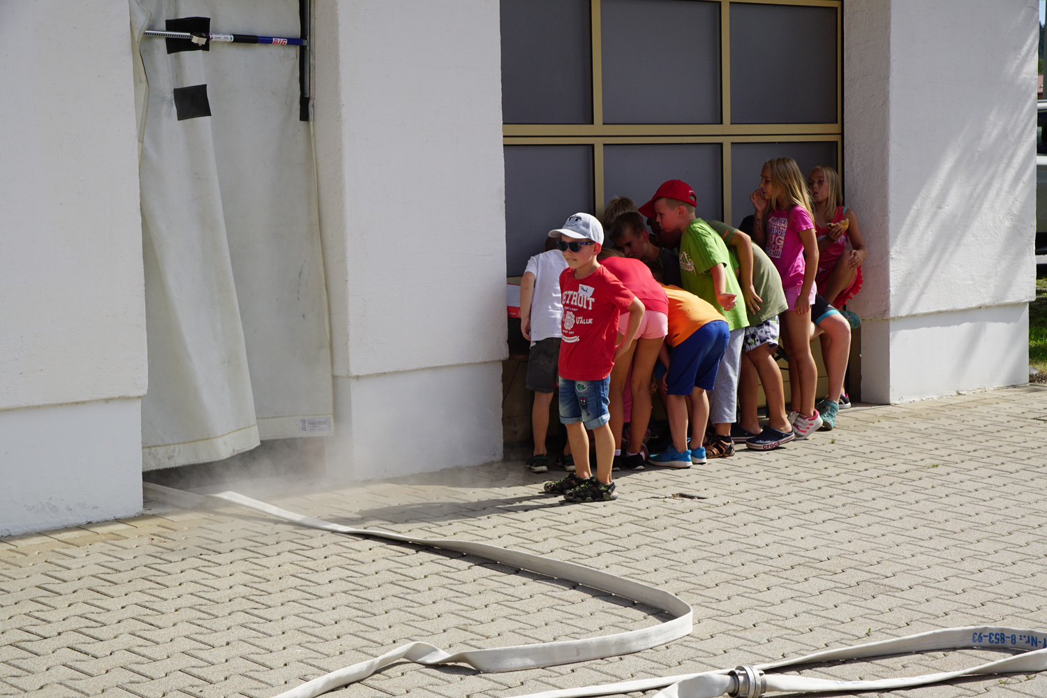 Da es ein recht heißer Tag war, konnten es die Kinder kaum erwarten, bis sie endlich selbst ans Strahlrohr durften. Dabei zielten sie nicht nur auf die aufgestellten Dosen – viel schöner war es natürlich, wenn sie auch mal einen der Betreuer nass machen konnten.