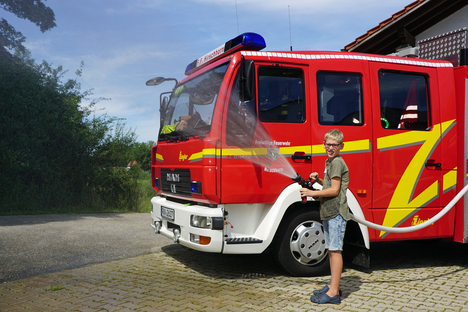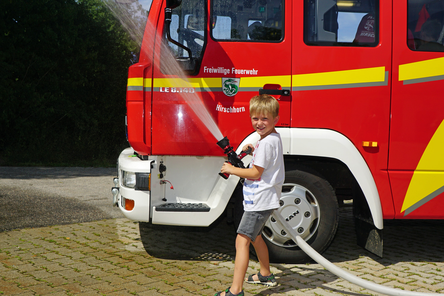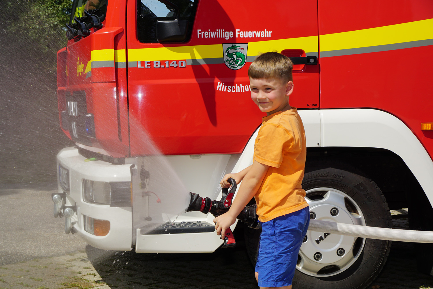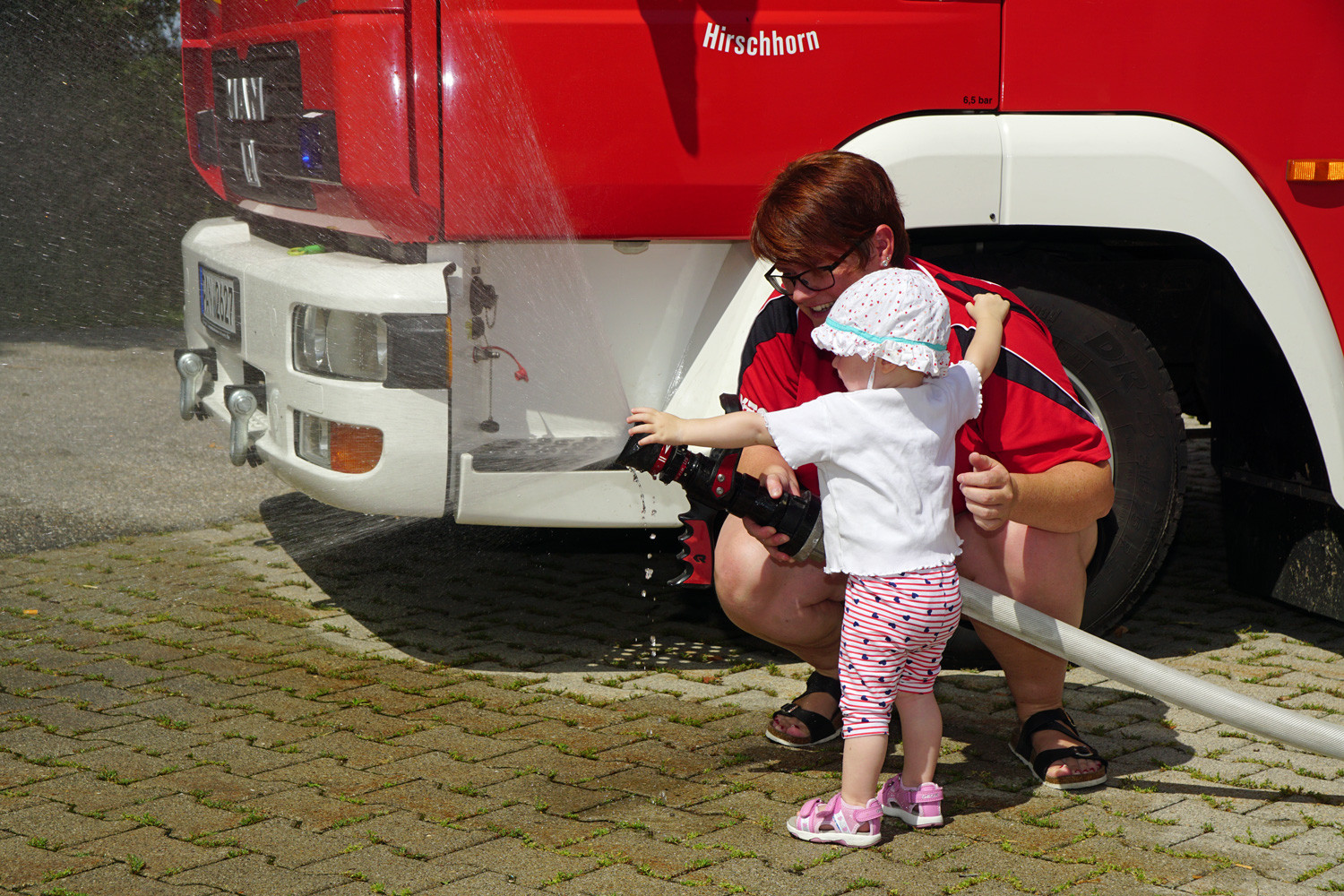 Da es ein recht heißer Tag war, konnten es die Kinder kaum erwarten, bis sie endlich selbst ans Strahlrohr durften. Dabei zielten sie nicht nur auf die aufgestellten Dosen – viel schöner war es natürlich, wenn sie auch mal einen der Betreuer nass machen konnten.