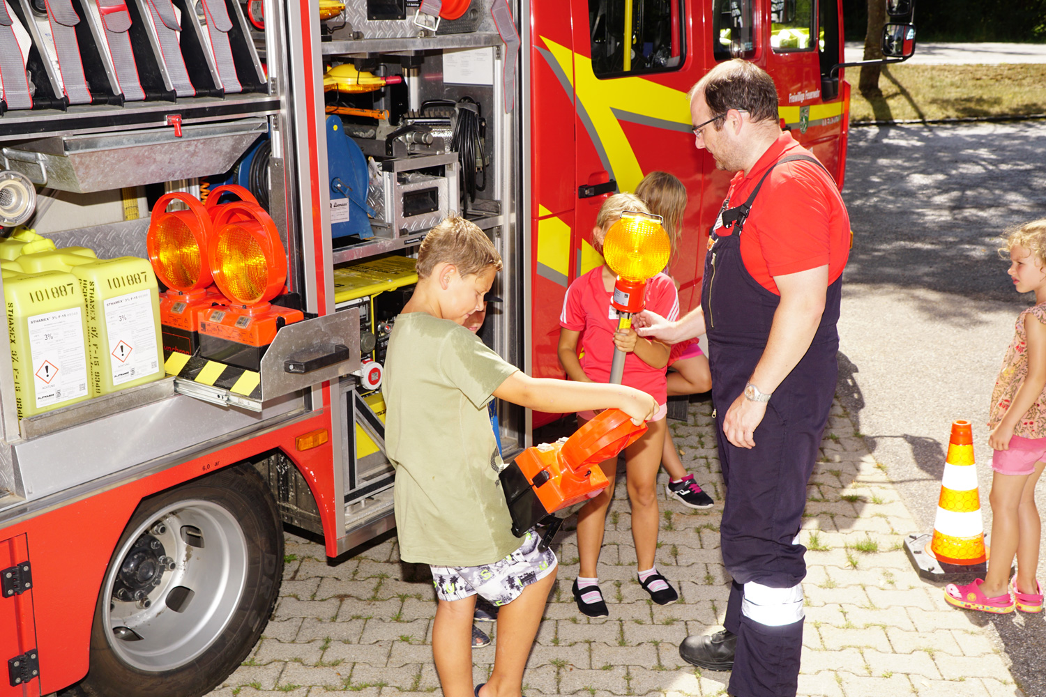 Unser 1. Kommandant und Organisationschef Stefan Holfelder begrüßte zusammen mit seinem Team alle sehr herzlich und gab einen Überblick, was die Kids so alles erwarten werde. Anschließend wurde im Schulungsraum ein kindgerechter Lehrfilm über den Ablauf eines Notrufs durch ein Kind gezeigt. Dann wurden die Teilnehmer in drei Gruppen aufgeteilt, die von Feuerwehrangehörigen geleitet wurden. Die Kinder wurden durch die verschiedenen Räume des Feuerwehrhauses geführt und durften natürlich auch die Feuerwehrautos genau anschauen. Sie erhielten viele Infos über die Ausstattung unserer Wehr und die persönliche Schutzausrüstung der Feuerwehrleute. Natürlich durfte fast alles auch angefasst und ausprobiert werden.