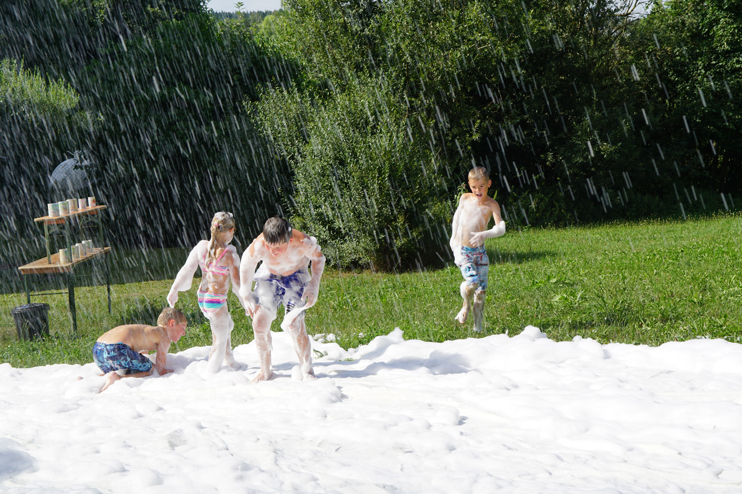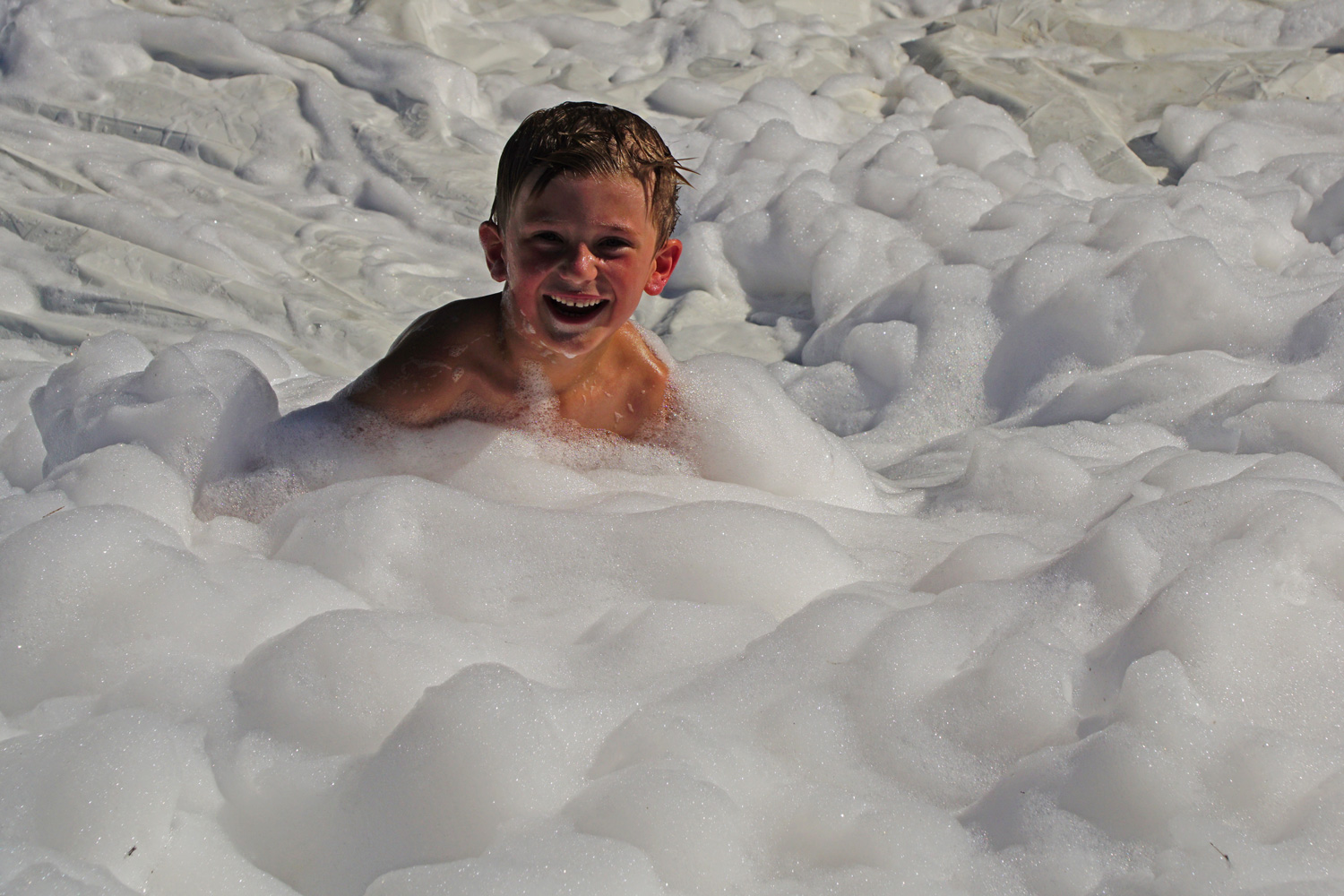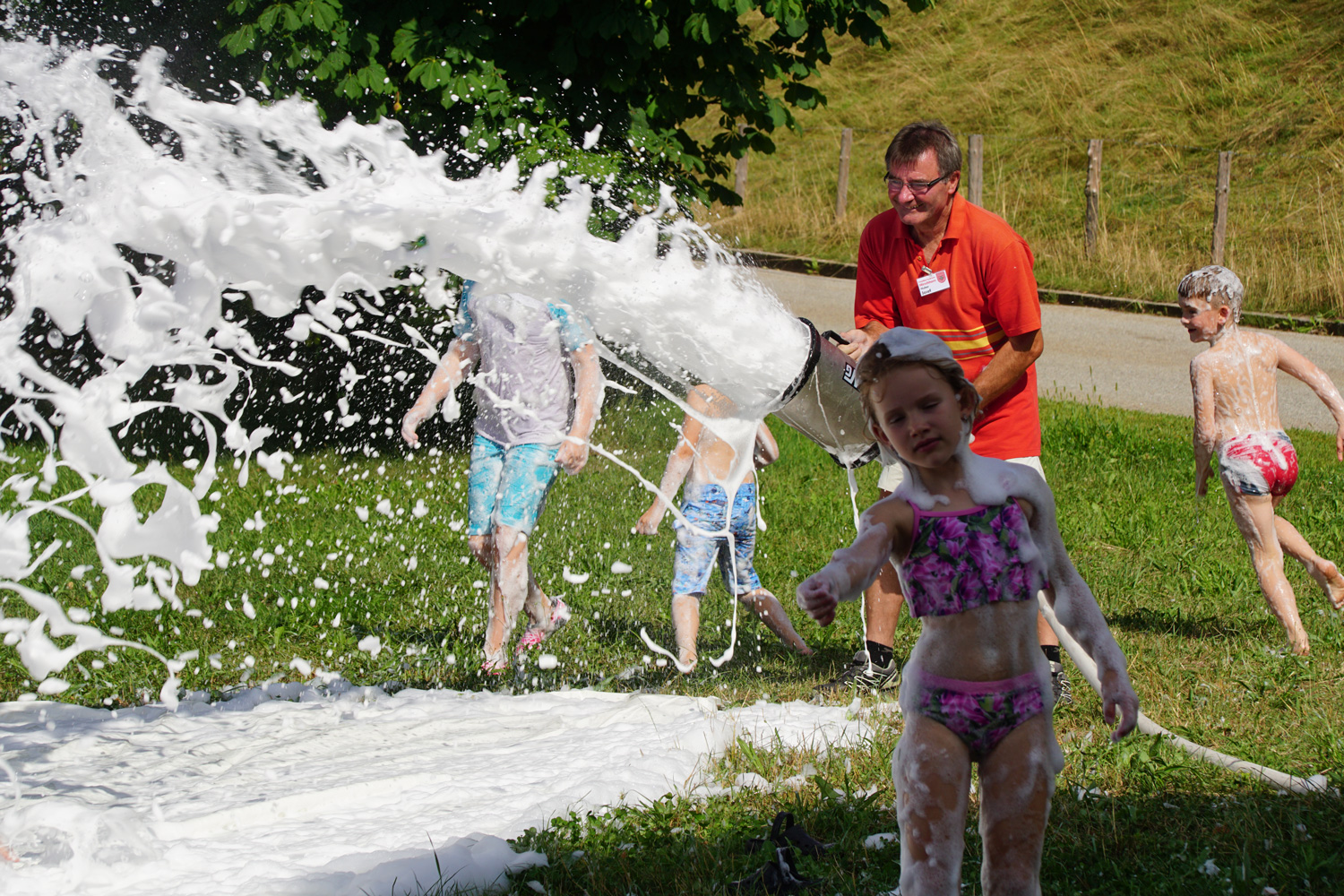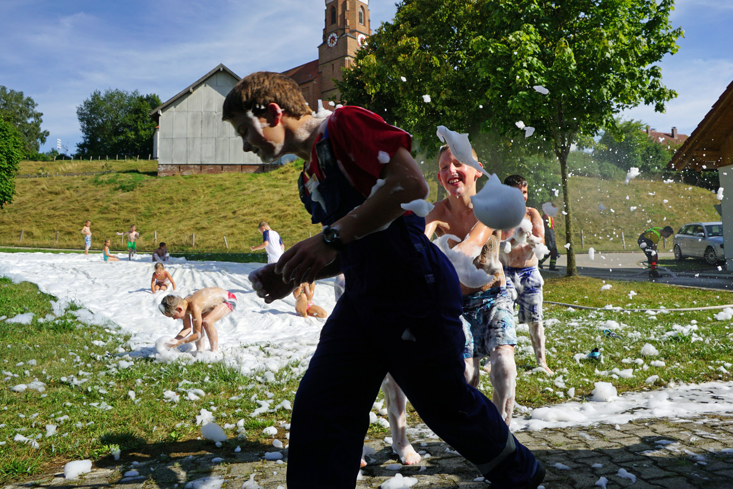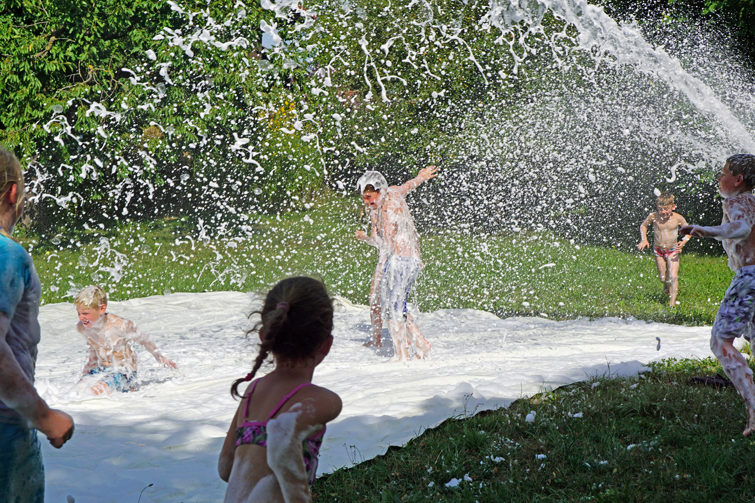 Der krönende Abschluss war dann aber die Schaumparty. Die Feuerwehr legte einen großen Schaumteppich (aus Babyshampoo) aus, auf dem die Kinder nach Herzenslust bis zur Erschöpfung rutschen und sich austoben konnten.