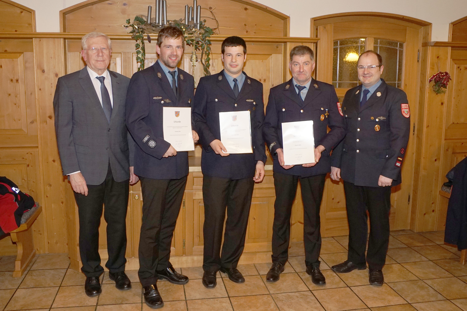 Kommandant Stefan Holfelder beförderte anschließend die jungen Kameraden Marcel Kink und Gabriel Brunner zum Feuerwehrmann sowie das neue Vorstandsmitglied Julian Moser zum Oberfeuerwehrmann.