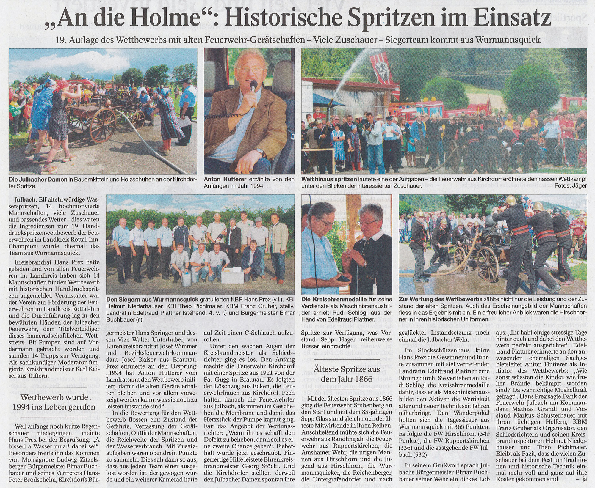 Den 19. Handdruckspritzenwettbewerb des Landkreises Rottal-Inn richtete heuer die Feuerwehr Julbach aus. 14 Mannschaften mit insgesamt 11 historischen Handdruckspritzen nahmen daran teil. Unsere 1. Mannschaft belegte hinter dem Sieger aus Wurmannsquick den ausgezeichneten zweiten Platz. Auch unsere Feuerwehrjugend versuchte sich erstmals im Löschen mit Muskelkraft und landete dabei auf Platz 10.