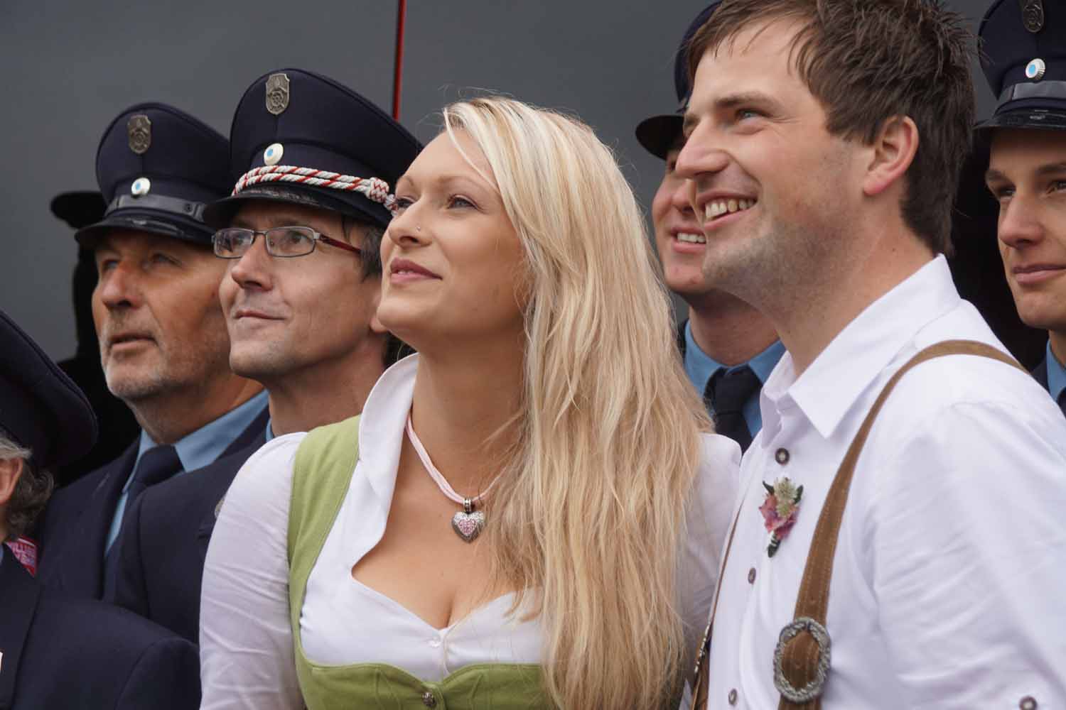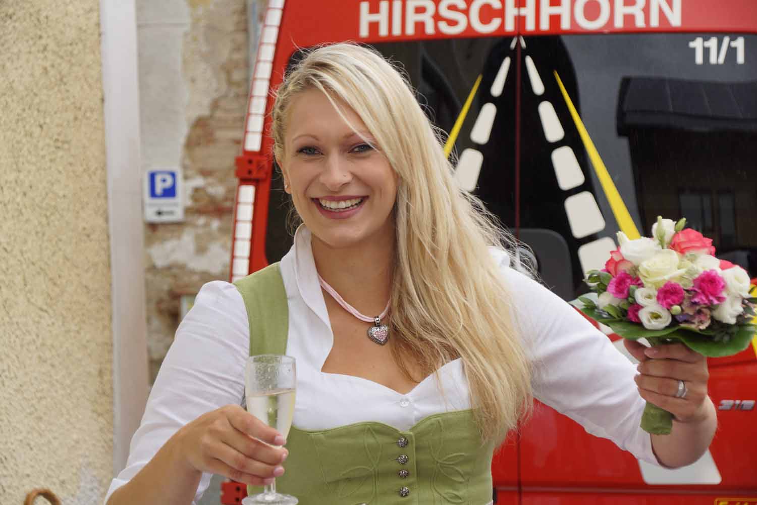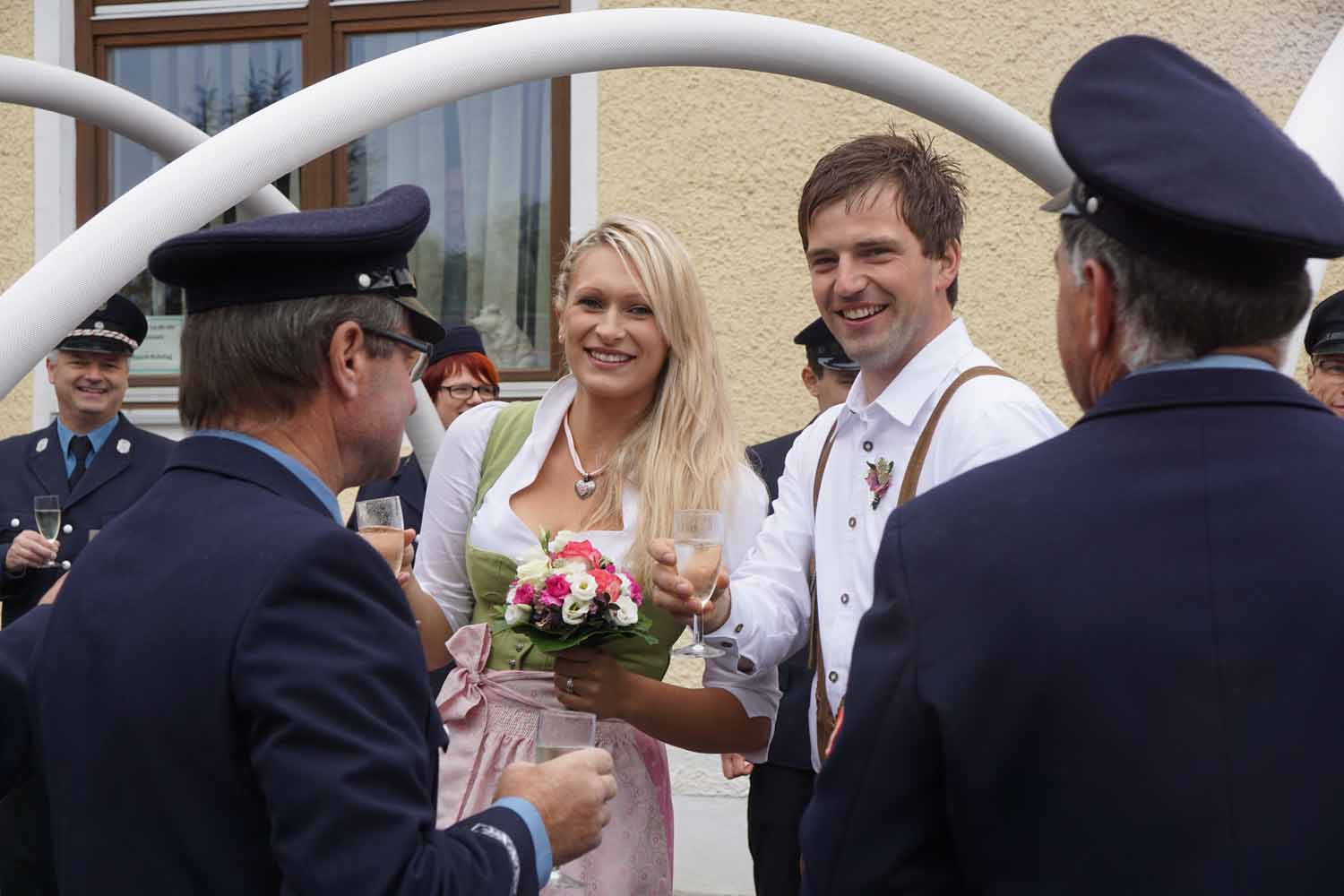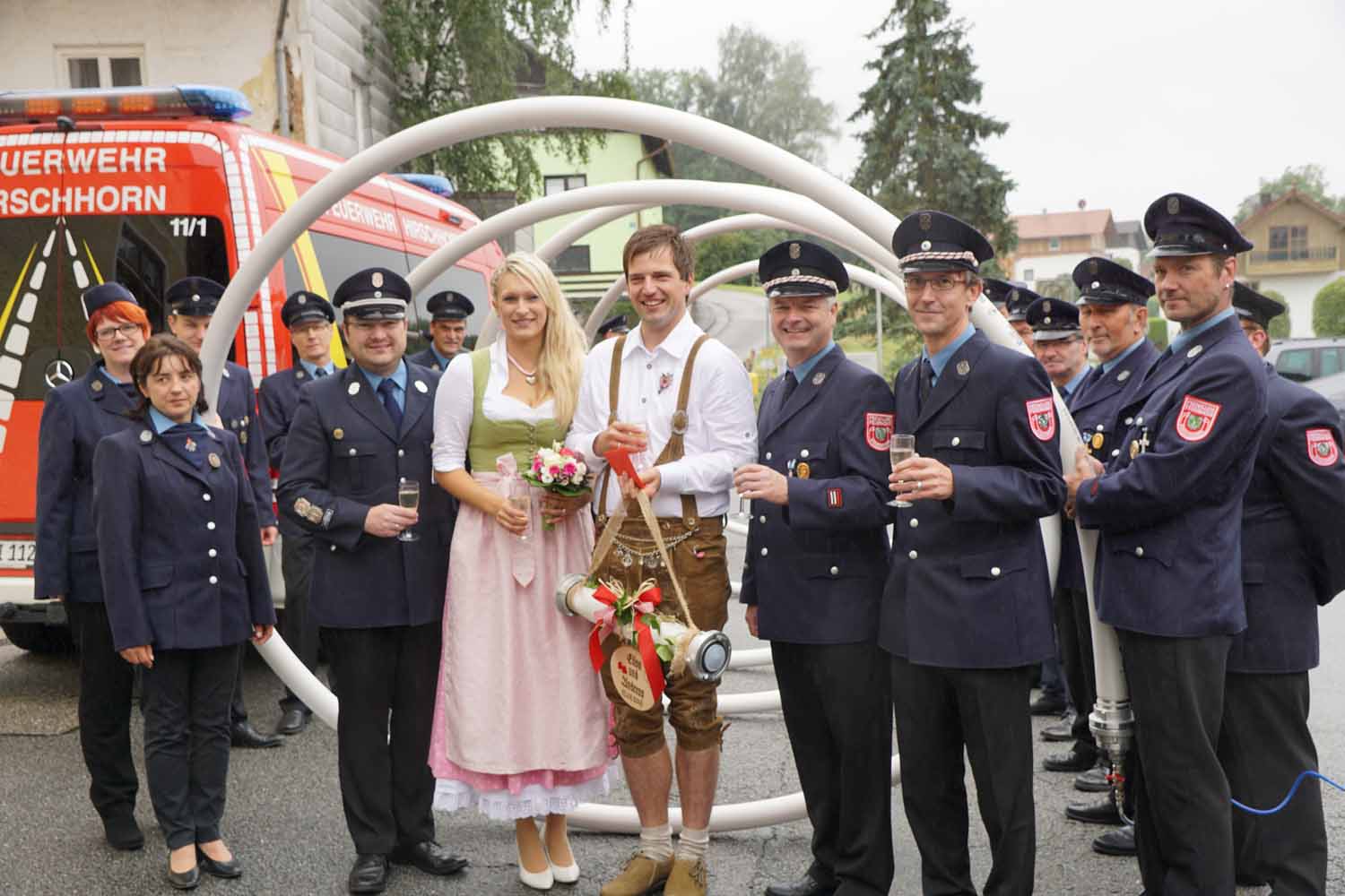 Hier überraschten wir die Hochzeitsleute mit unseren Feuerwehrautos und einem Feuerwehrspalier. Natürlich gratulierten wir den beiden ganz herzlich und stießen mit einem Glas Sekt auf das frisch vermählte Paar an.
