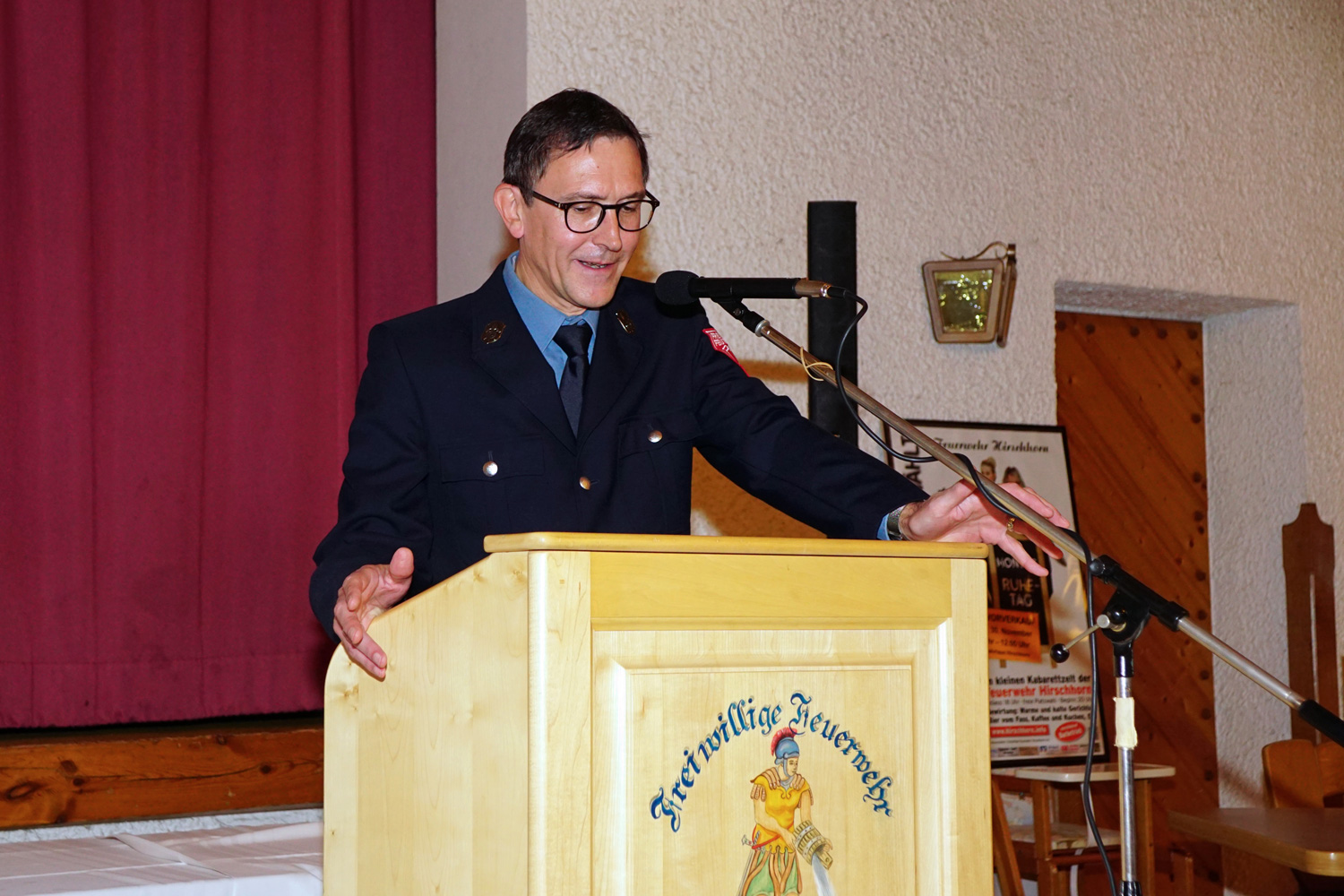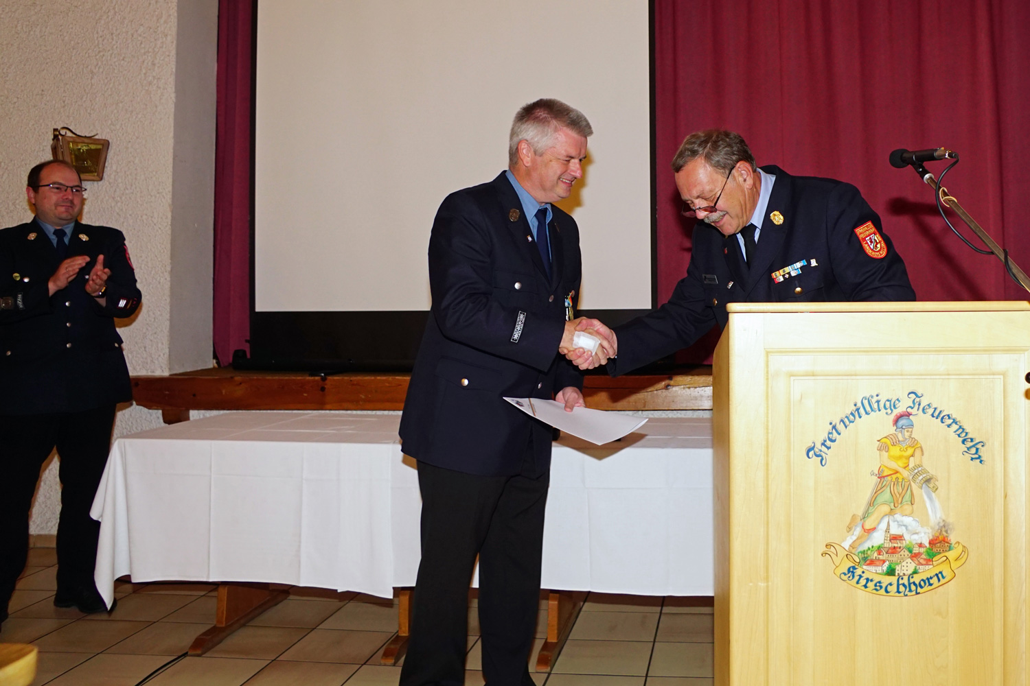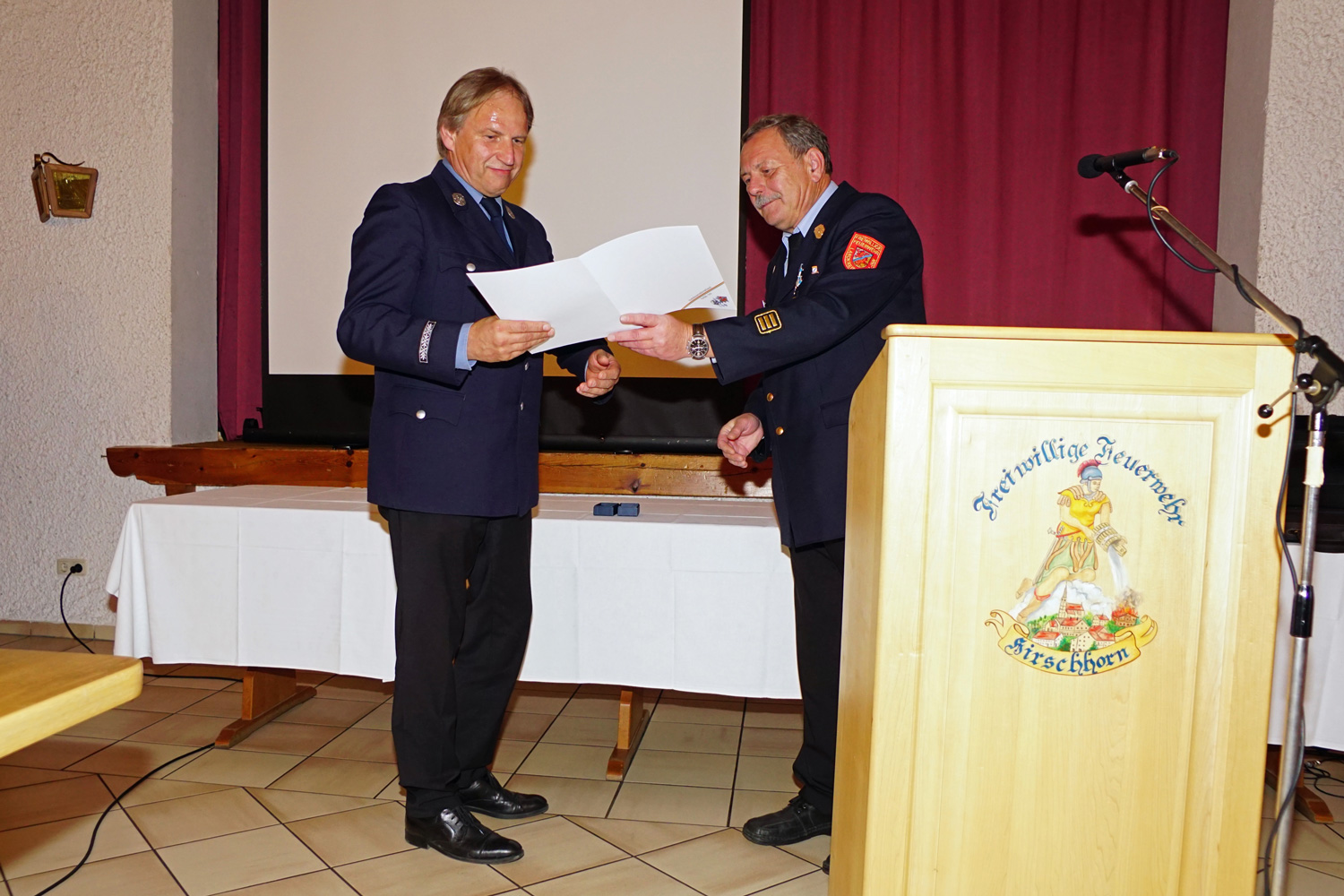 Als nächstes ergriff Kreisbrandinspektor Hans Schachtner das Wort. Nach seinen Grußworten eröffnete er den Gästen, dass er heute zwei sehr verdienten Feuerwehrkameraden der Hirschhorner Wehr eine besondere Auszeichnung überreichen werde. Da fast niemand wusste, um wem es sich handelte – speziell nicht die Geehrten – waren alle ganz gespannt wer es sein würde. Nachdem er den Werdegang der beiden Kameraden ausführlich darlegte, wurde schnell klar, dass es sich um unseren 2. Vorstand Manfred Nußbaumer und um unseren Ehrenvorstand Hans Ries handeln würde.