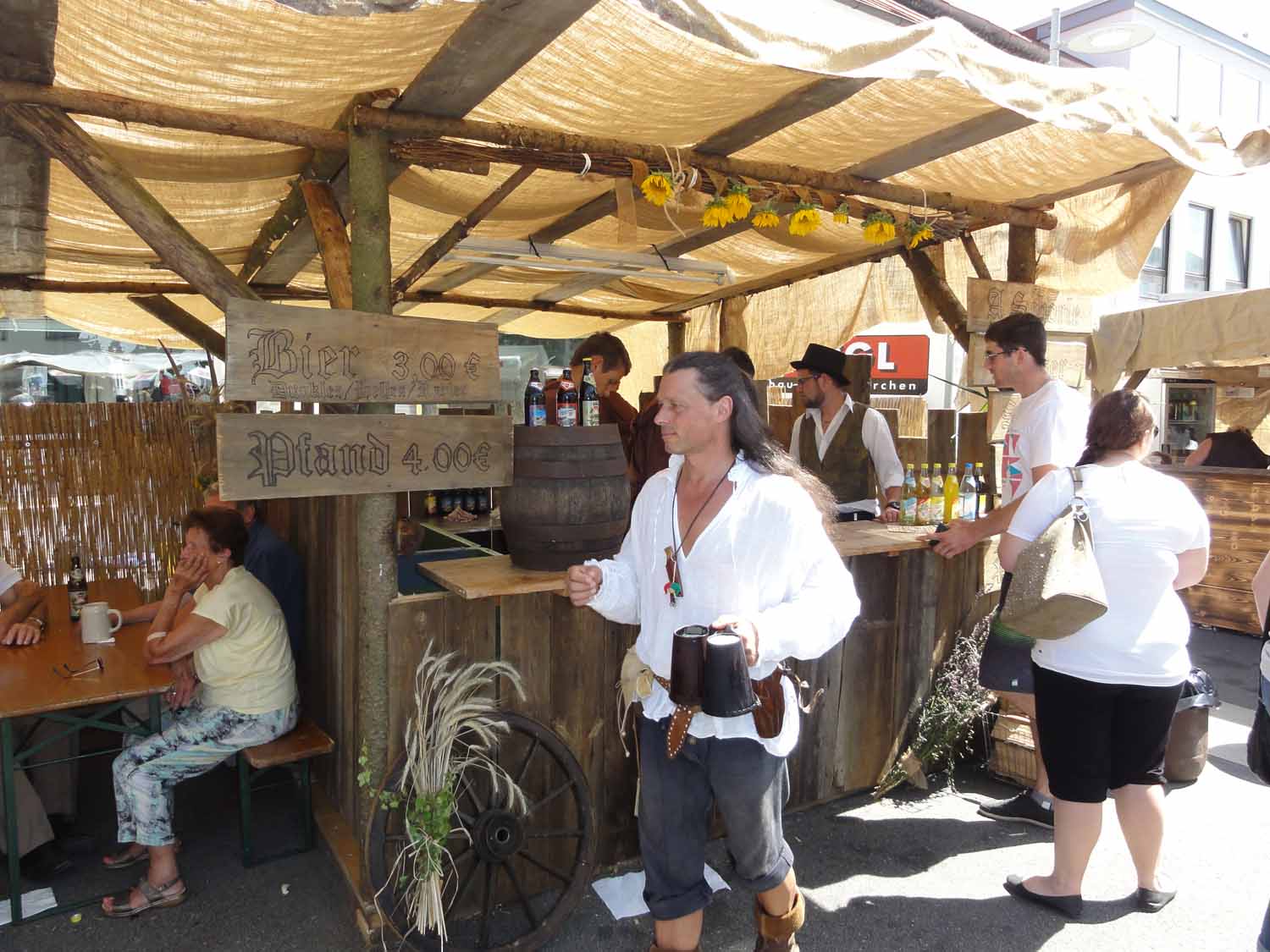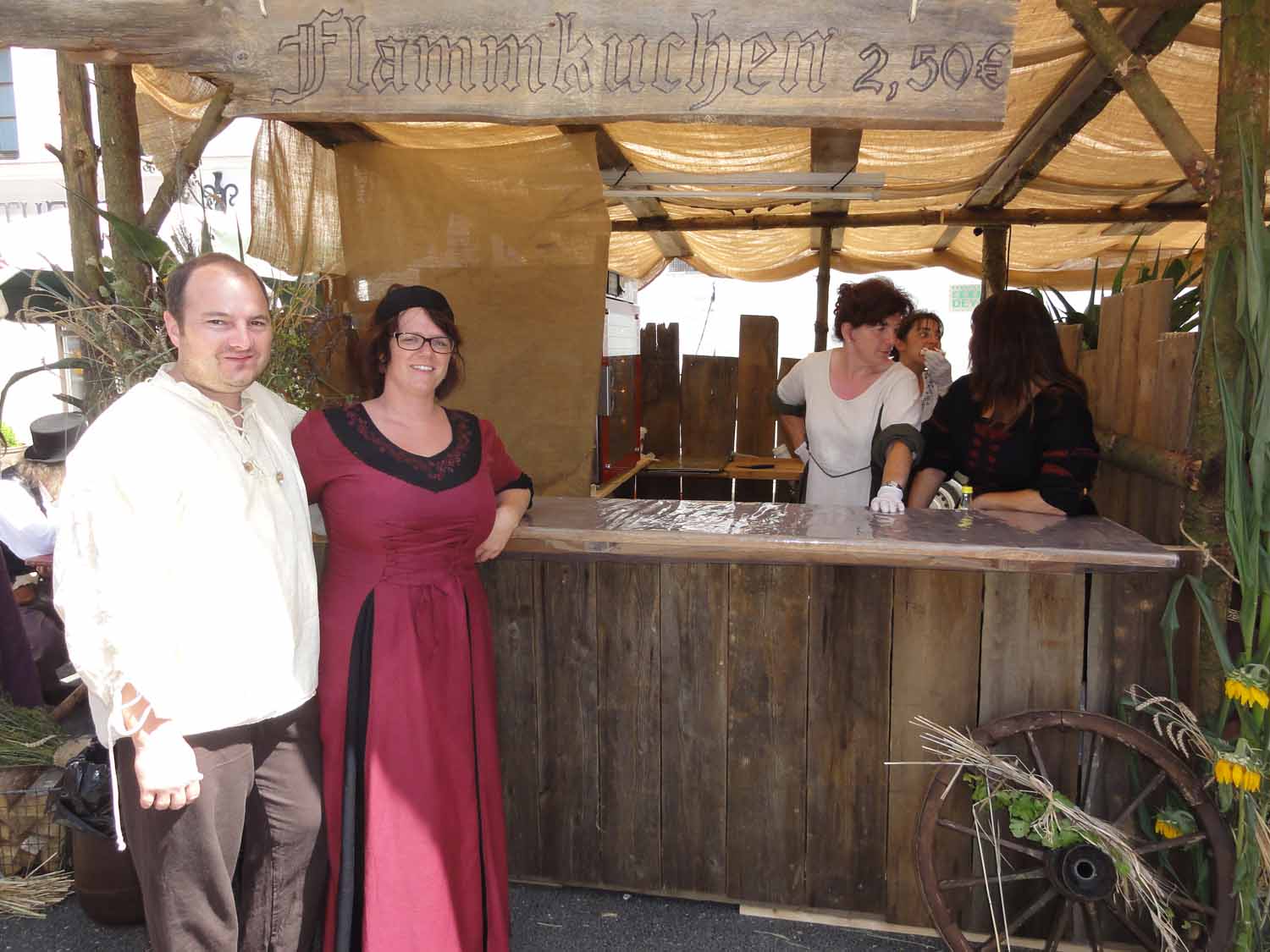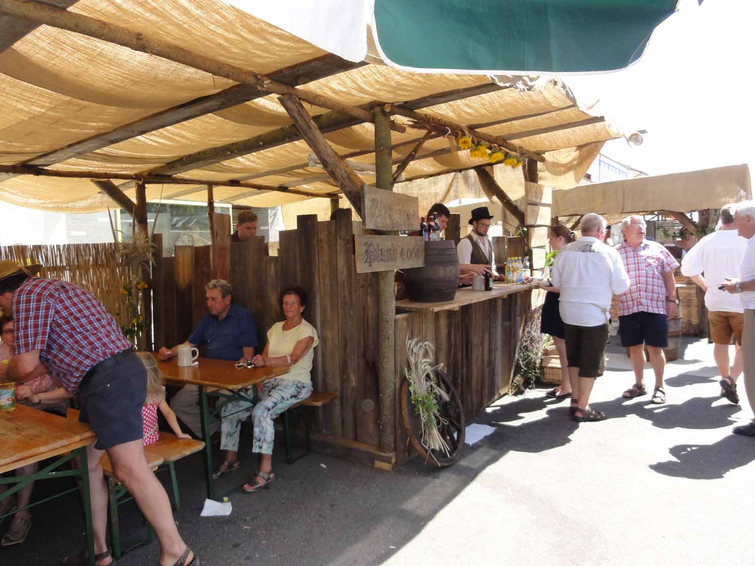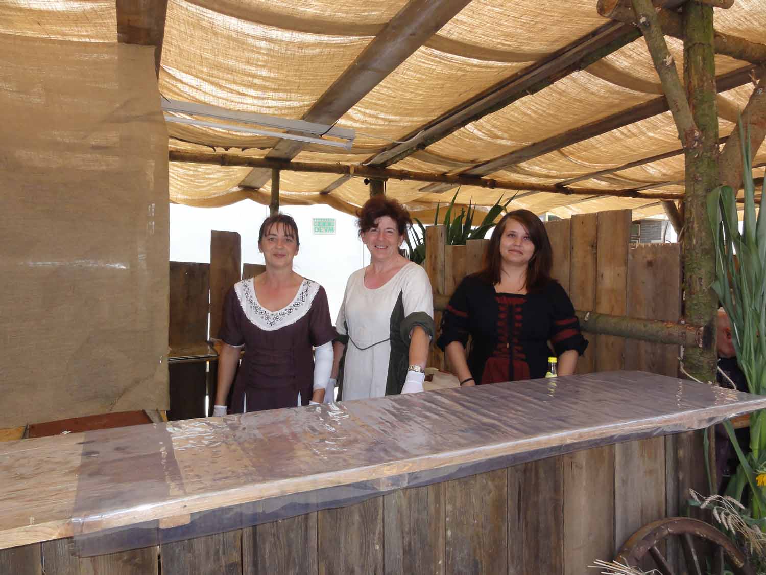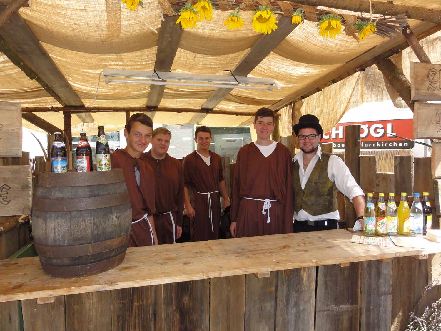 Bereits zwei Wochen zuvor traf man sich bei der Familie Ries in Steinbach, um mit viel Engagement möglichst mittelalterlich aussehende Stände zu bauen. Das Ergebnis konnte sich wirklich sehen lassen. Es waren zwei urige Hütten sowie ein überdachter Zwischenraum für die Gäste entstanden.