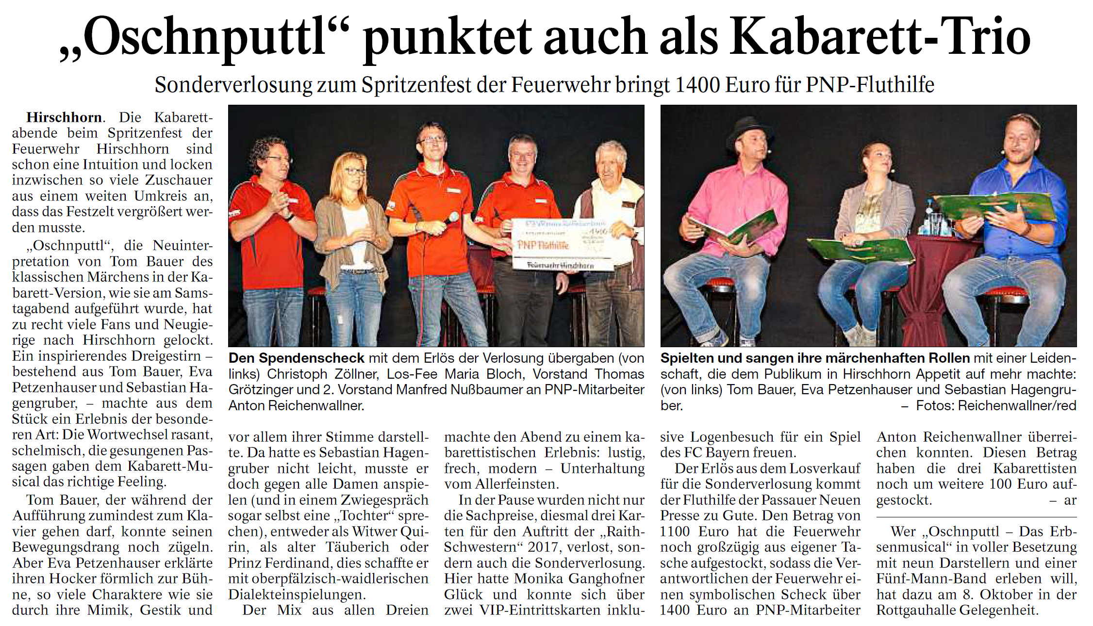 Stefan Wählt (der i von „Da Bertl und i“) war als Besucher beim Auftritt von Oschnputtl bei uns zu Gast. Eva Petzenhauser und Stefan Wählt werden ab dem nächsten Jahr das Kabarettduo „Petzenhauser & Wählt“ bilden und mit ihrem ersten gemeinsamen Programm „G’essn wird dahoam“ frischen Wind in die Kabarettszene bringen. Sowohl unser Publikum wie auch wir würden uns sehr freuen, wenn die beiden beim Spritzenfest 2018 bei uns auftreten würden. Dies machte unser Publikum mit einem riesen Applaus für Eva und Stefan eindeutig klar.