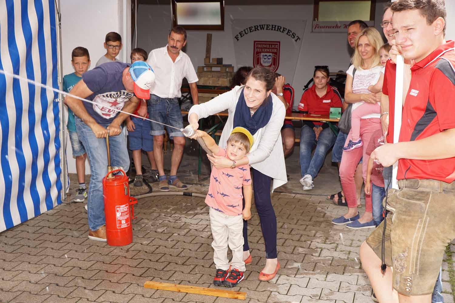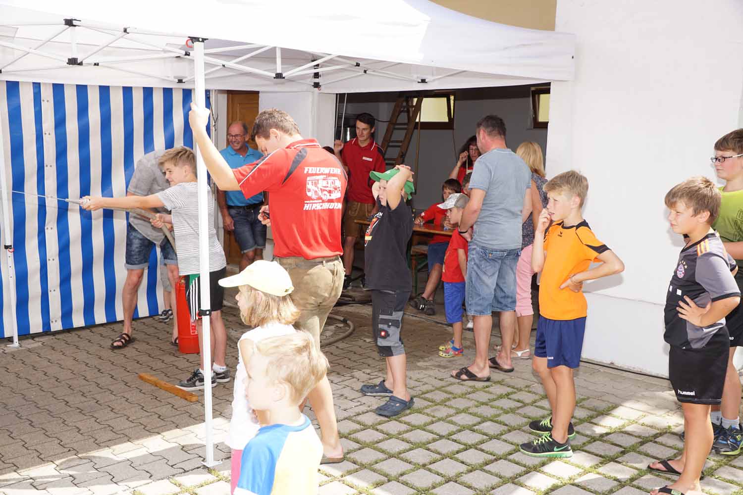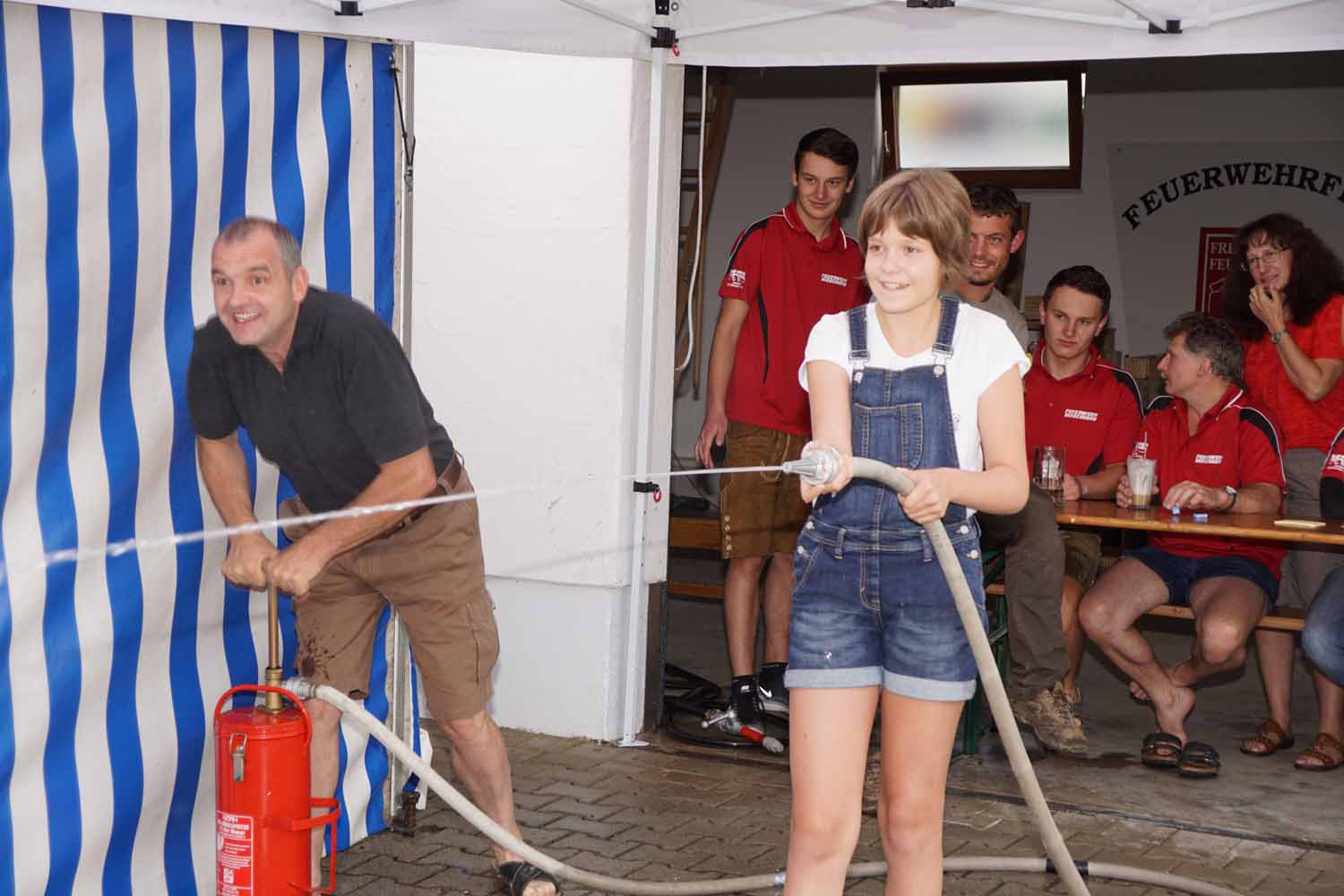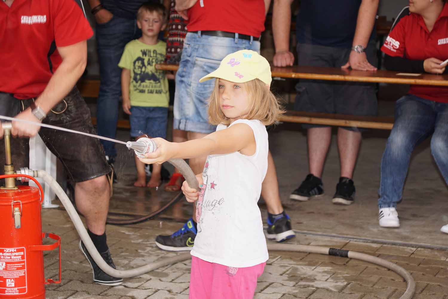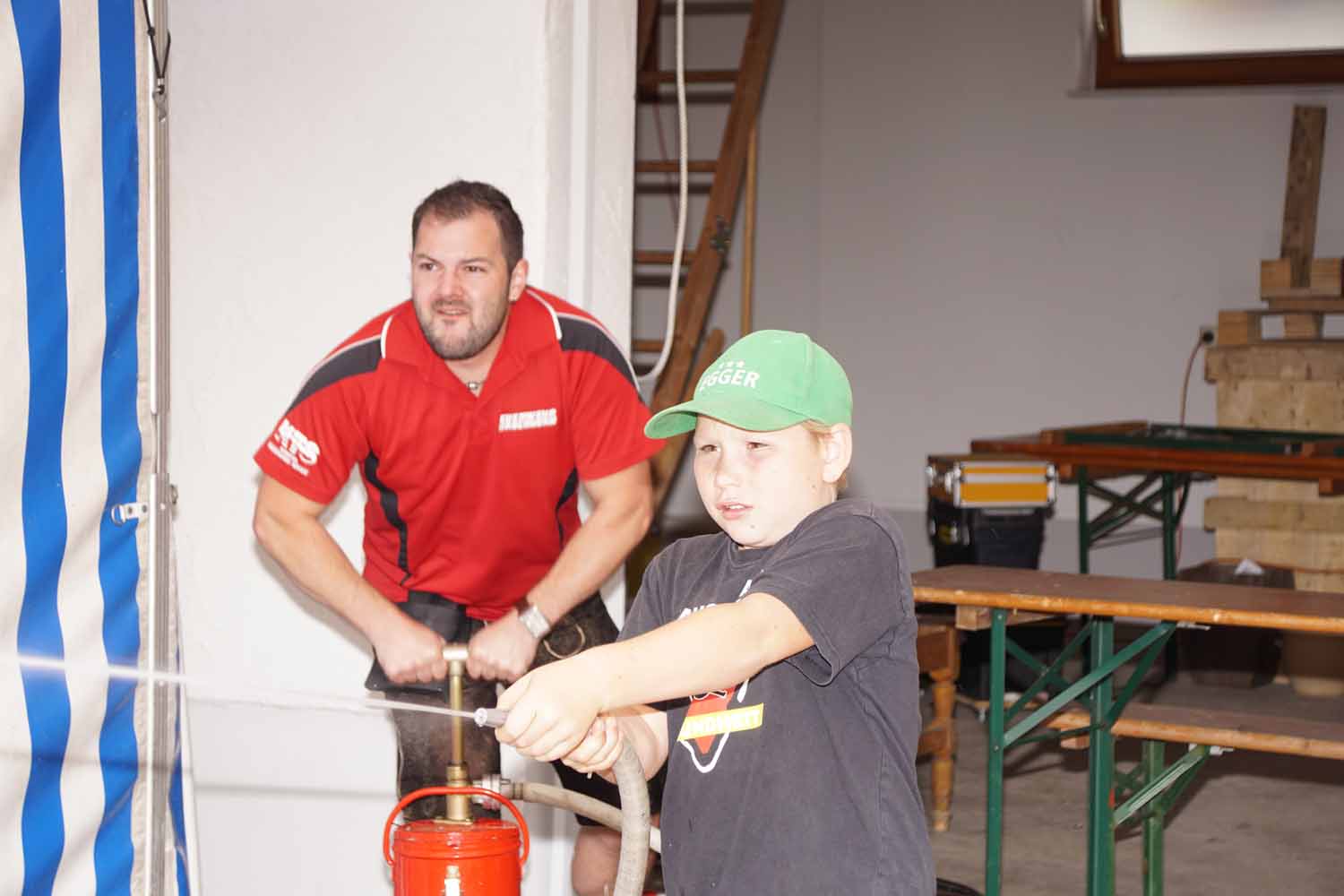 Das Highlight für die Kids war aber der von Christoph Ferschmann organisierte Kinder-Spritzenwettbewerb. Hierbei durften die Kinder mit dem Strahlrohr einen „Brand“ löschen, während die Väter kräftig an der Kübelspritze pumpen mussten. Natürlich hielt die Feuerwehr für jedes teilnehmende Kind schöne Sachpreise parat.
