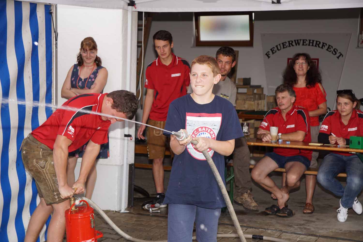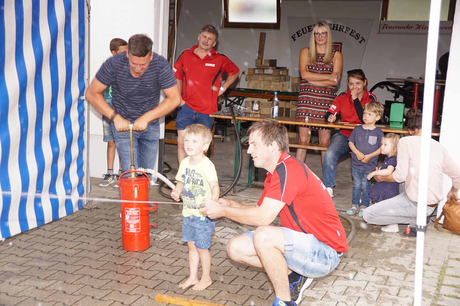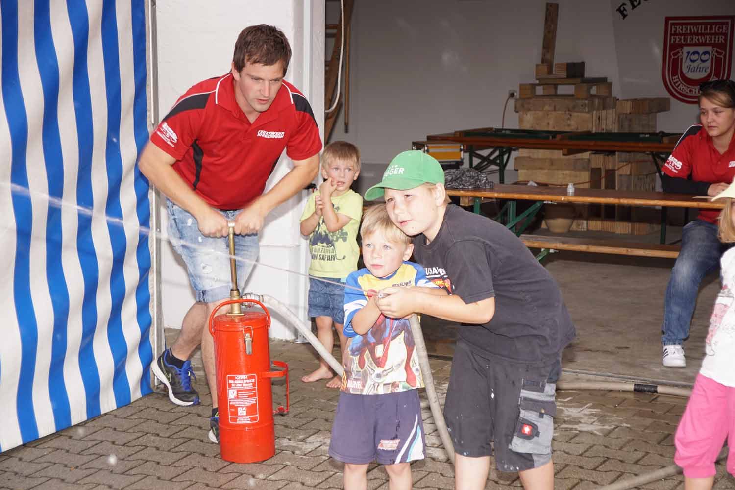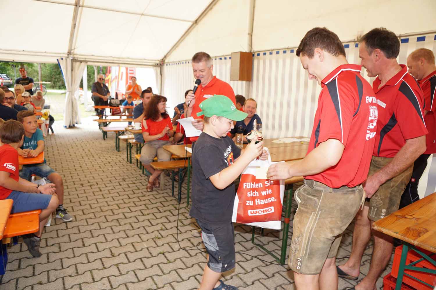Das Highlight für die Kids war aber der von Christoph Ferschmann organisierte Kinder-Spritzenwettbewerb. Hierbei durften die Kinder mit dem Strahlrohr einen „Brand“ löschen, während die Väter kräftig an der Kübelspritze pumpen mussten. Natürlich hielt die Feuerwehr für jedes teilnehmende Kind schöne Sachpreise parat.
