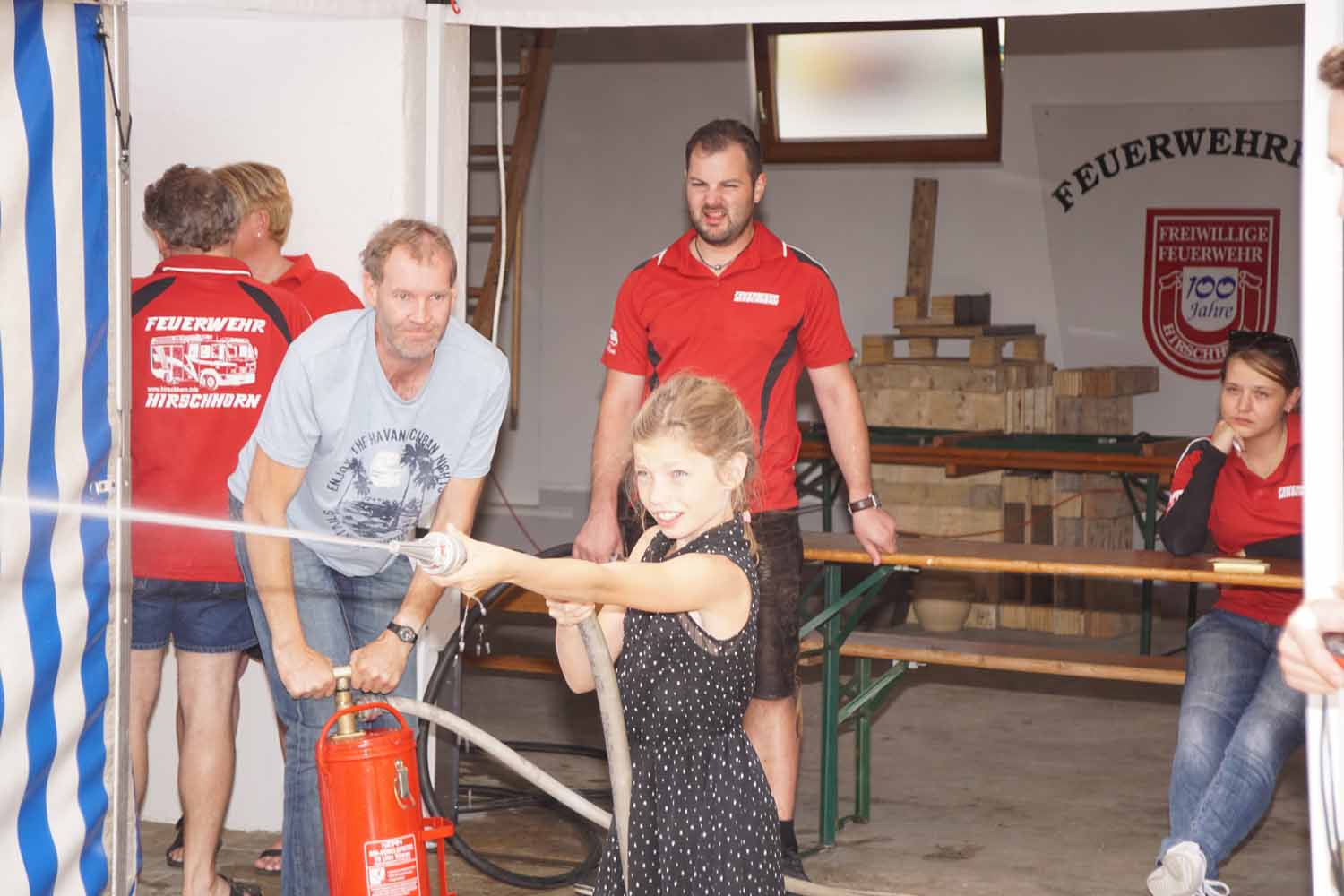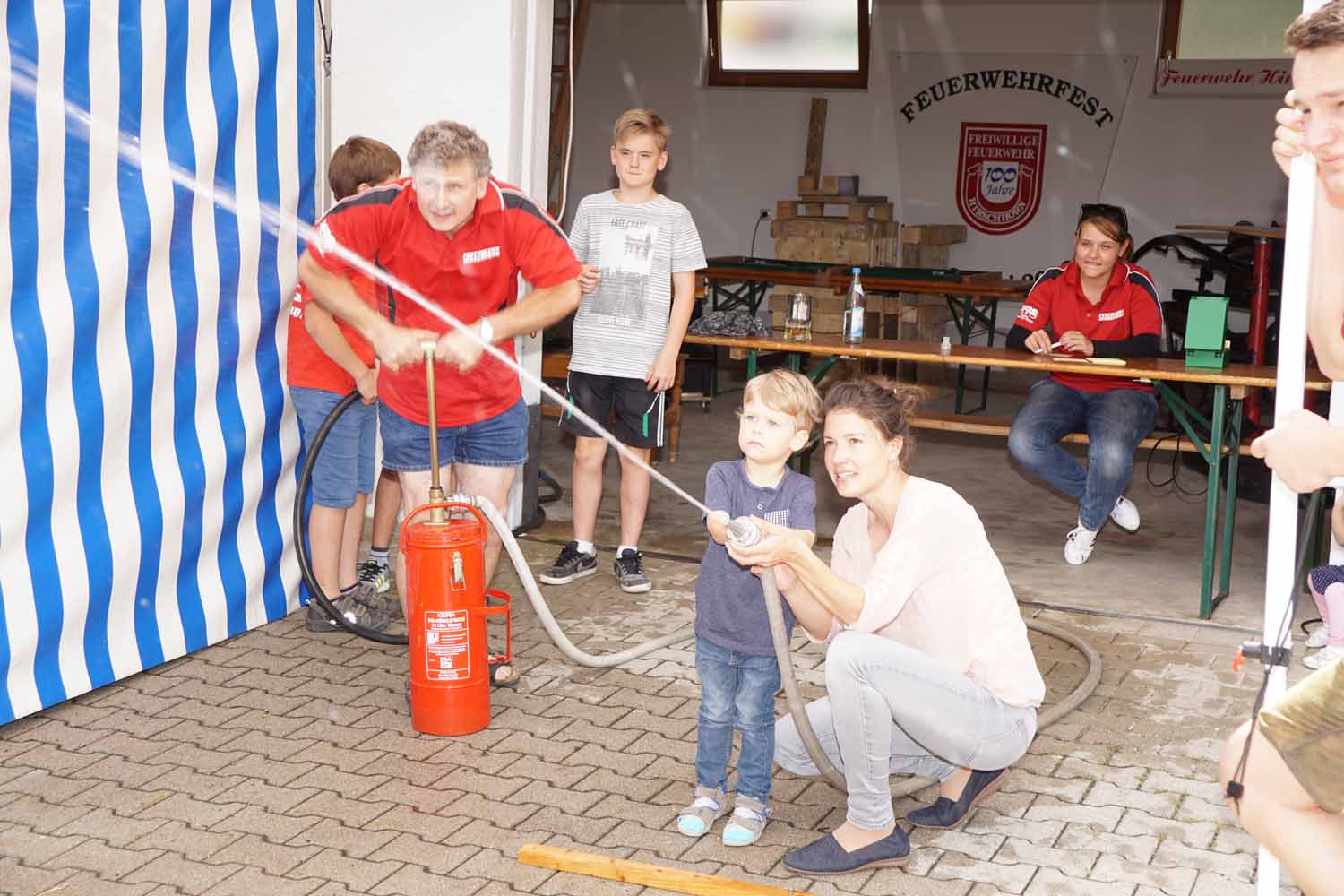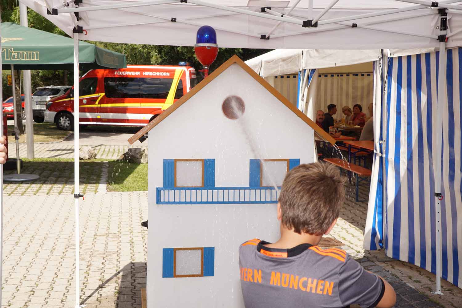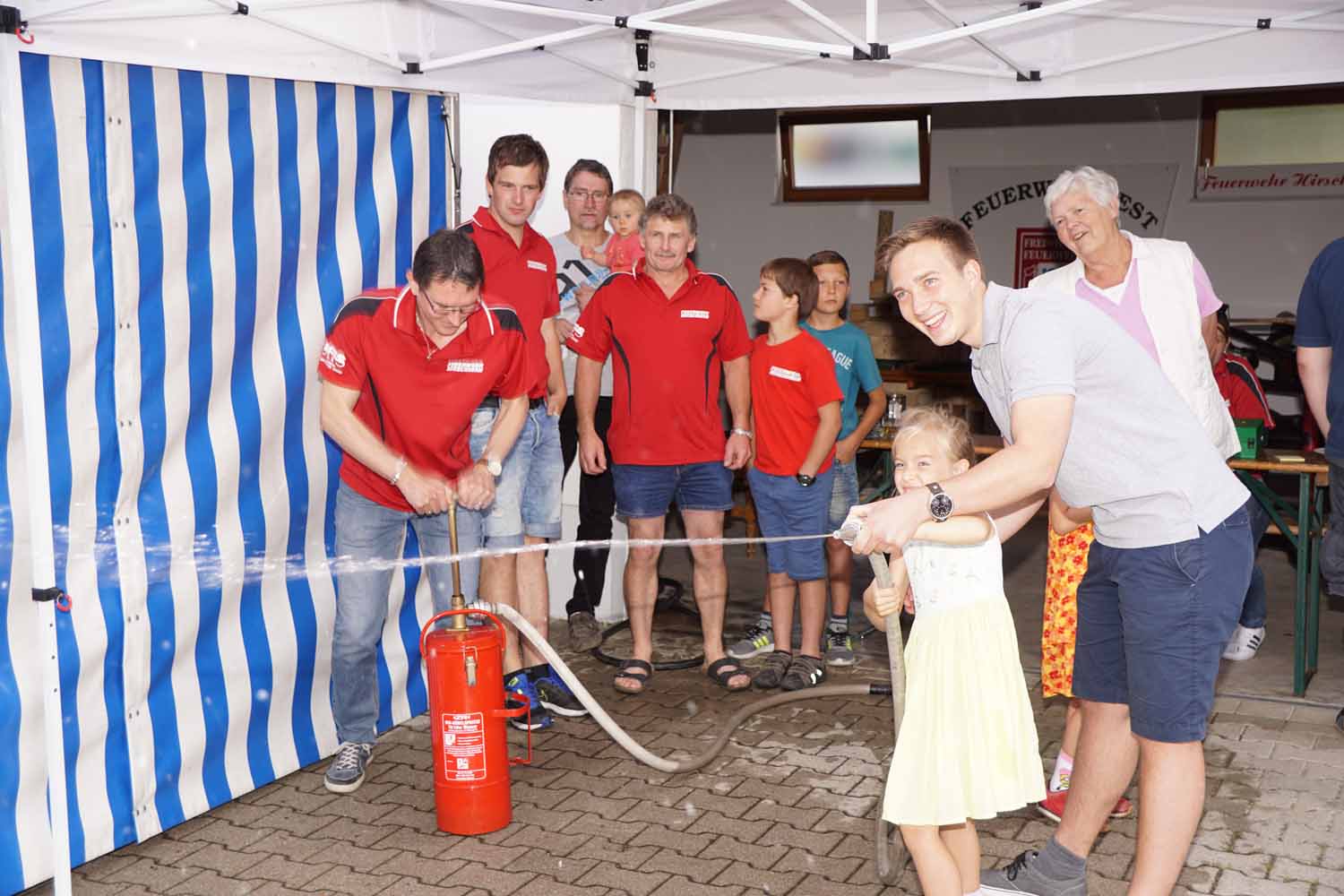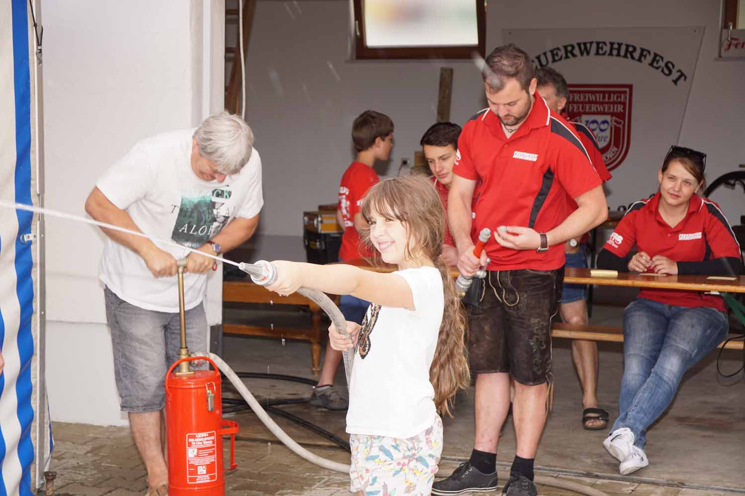 Das Highlight für die Kids war aber der von Christoph Ferschmann organisierte Kinder-Spritzenwettbewerb. Hierbei durften die Kinder mit dem Strahlrohr einen „Brand“ löschen, während die Väter kräftig an der Kübelspritze pumpen mussten. Natürlich hielt die Feuerwehr für jedes teilnehmende Kind schöne Sachpreise parat.