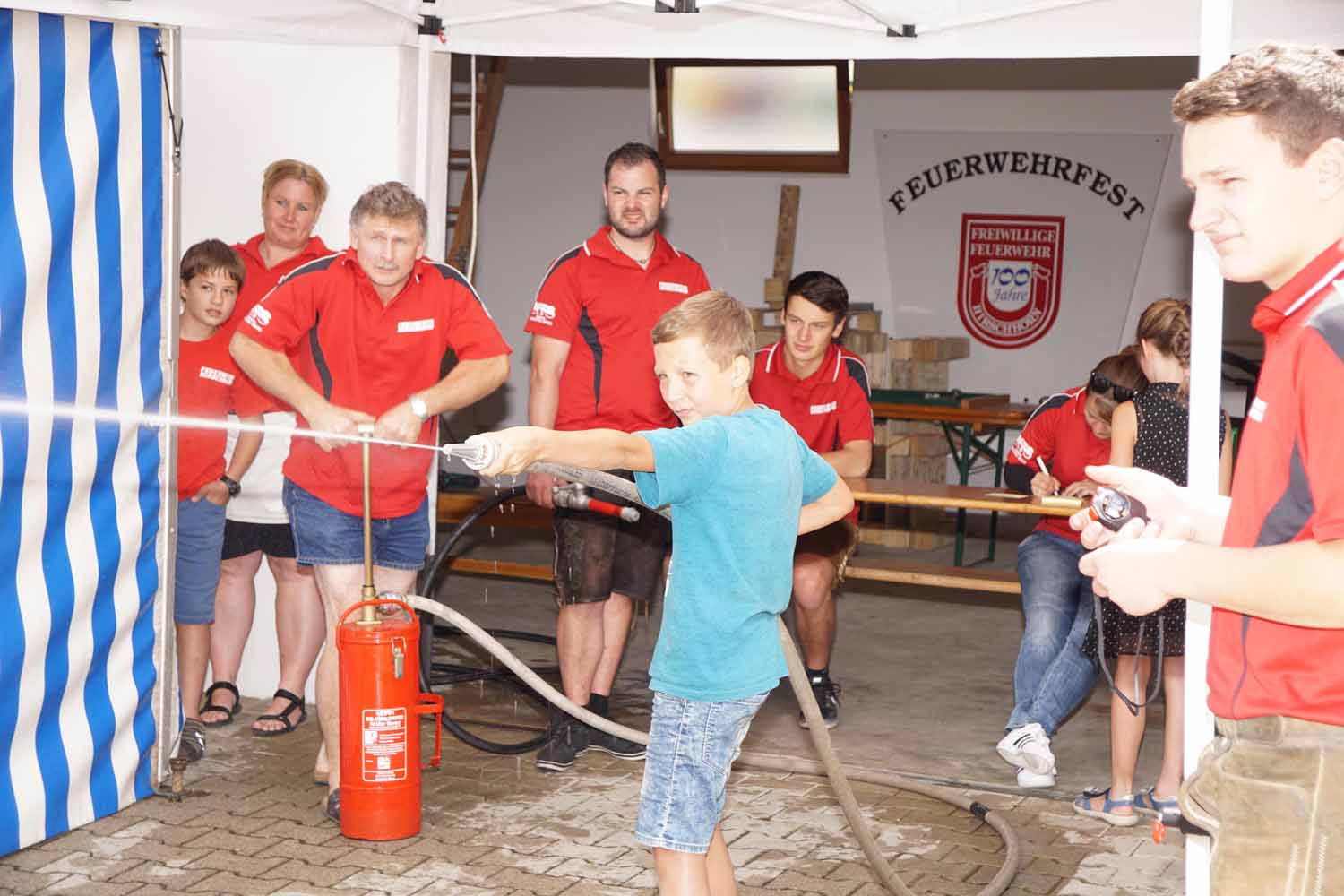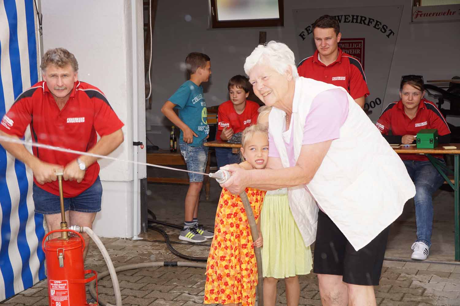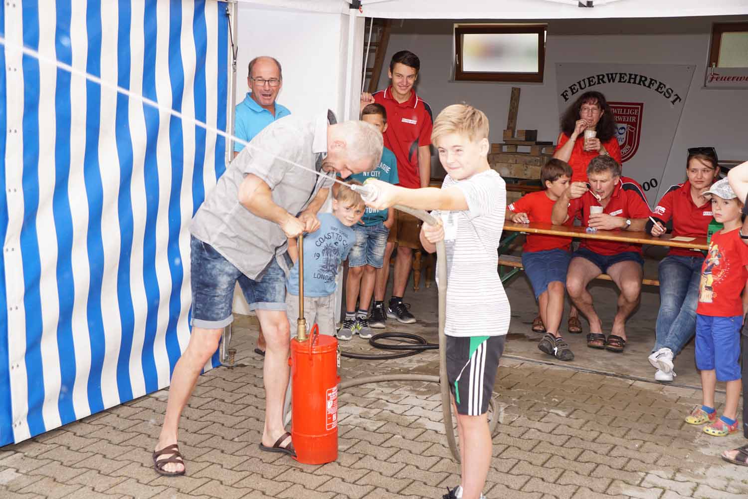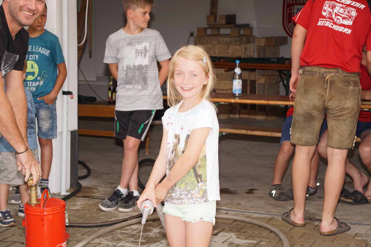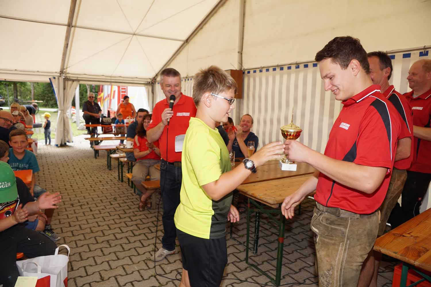 Das Highlight für die Kids war aber der von Christoph Ferschmann organisierte Kinder-Spritzenwettbewerb. Hierbei durften die Kinder mit dem Strahlrohr einen „Brand“ löschen, während die Väter kräftig an der Kübelspritze pumpen mussten. Natürlich hielt die Feuerwehr für jedes teilnehmende Kind schöne Sachpreise parat.