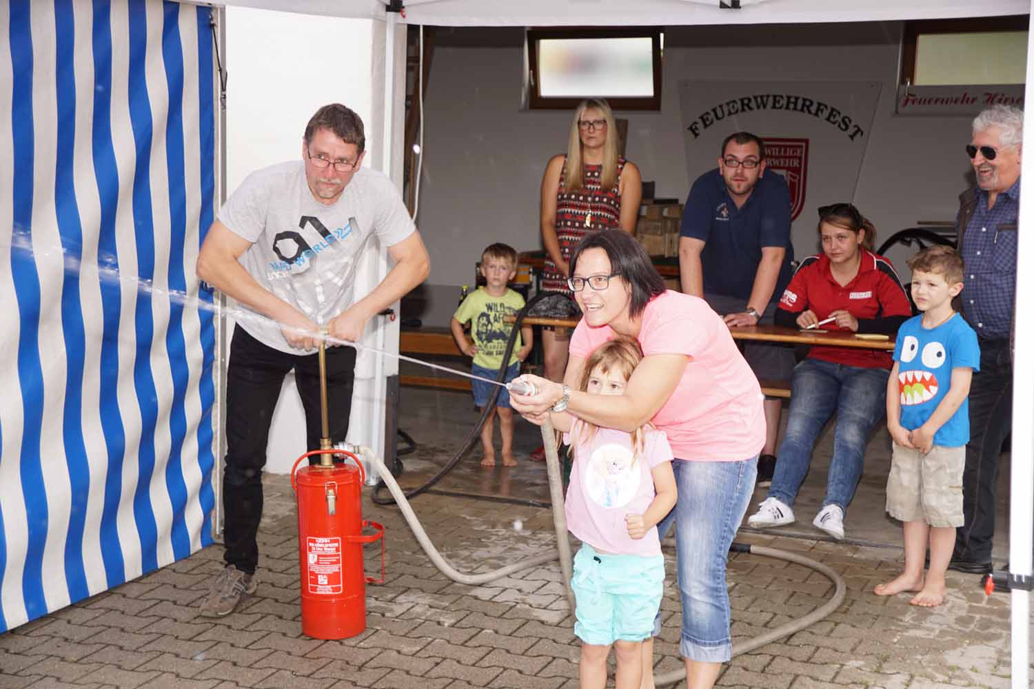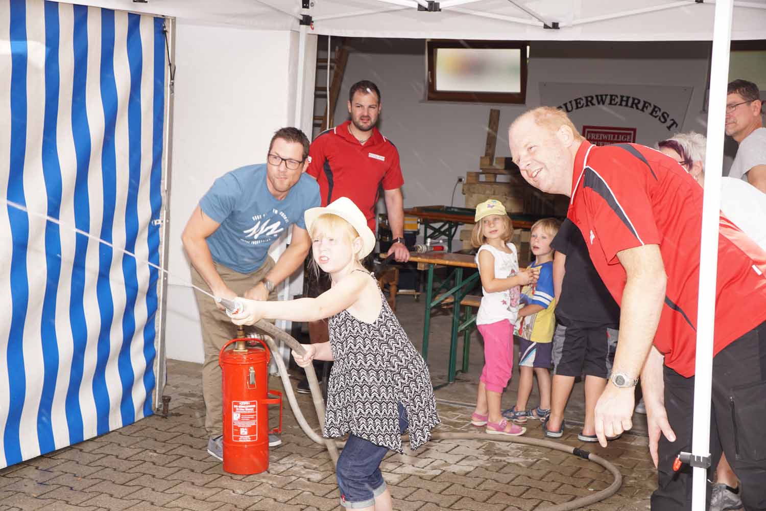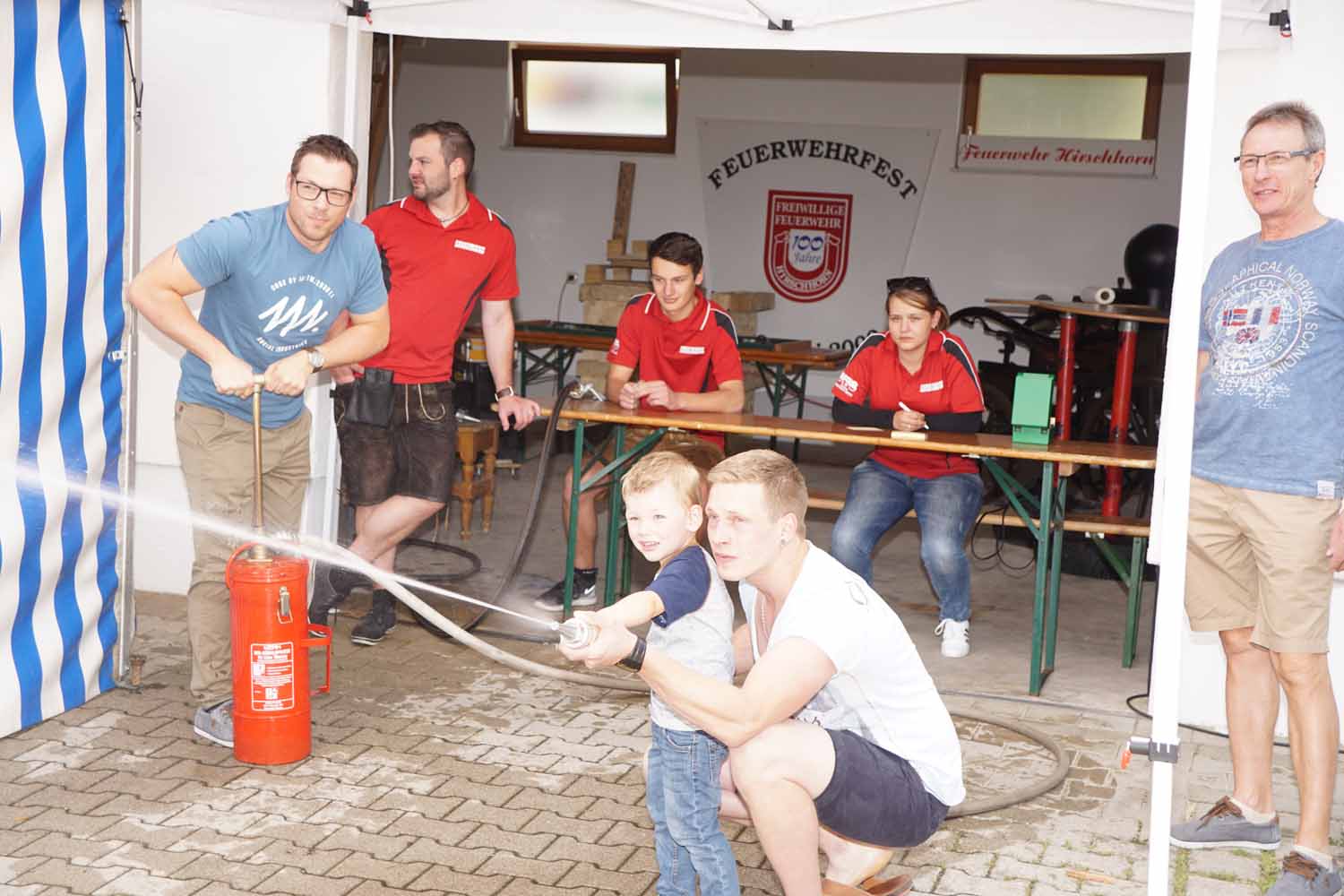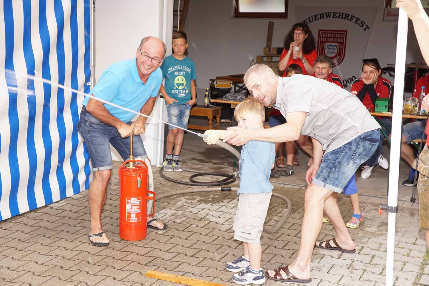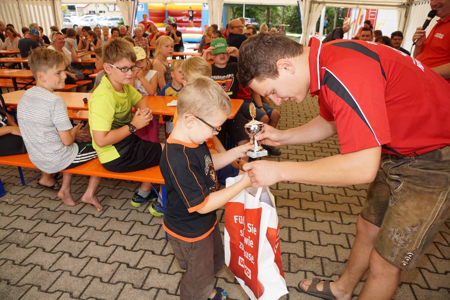 Das Highlight für die Kids war aber der von Christoph Ferschmann organisierte Kinder-Spritzenwettbewerb. Hierbei durften die Kinder mit dem Strahlrohr einen „Brand“ löschen, während die Väter kräftig an der Kübelspritze pumpen mussten. Natürlich hielt die Feuerwehr für jedes teilnehmende Kind schöne Sachpreise parat.