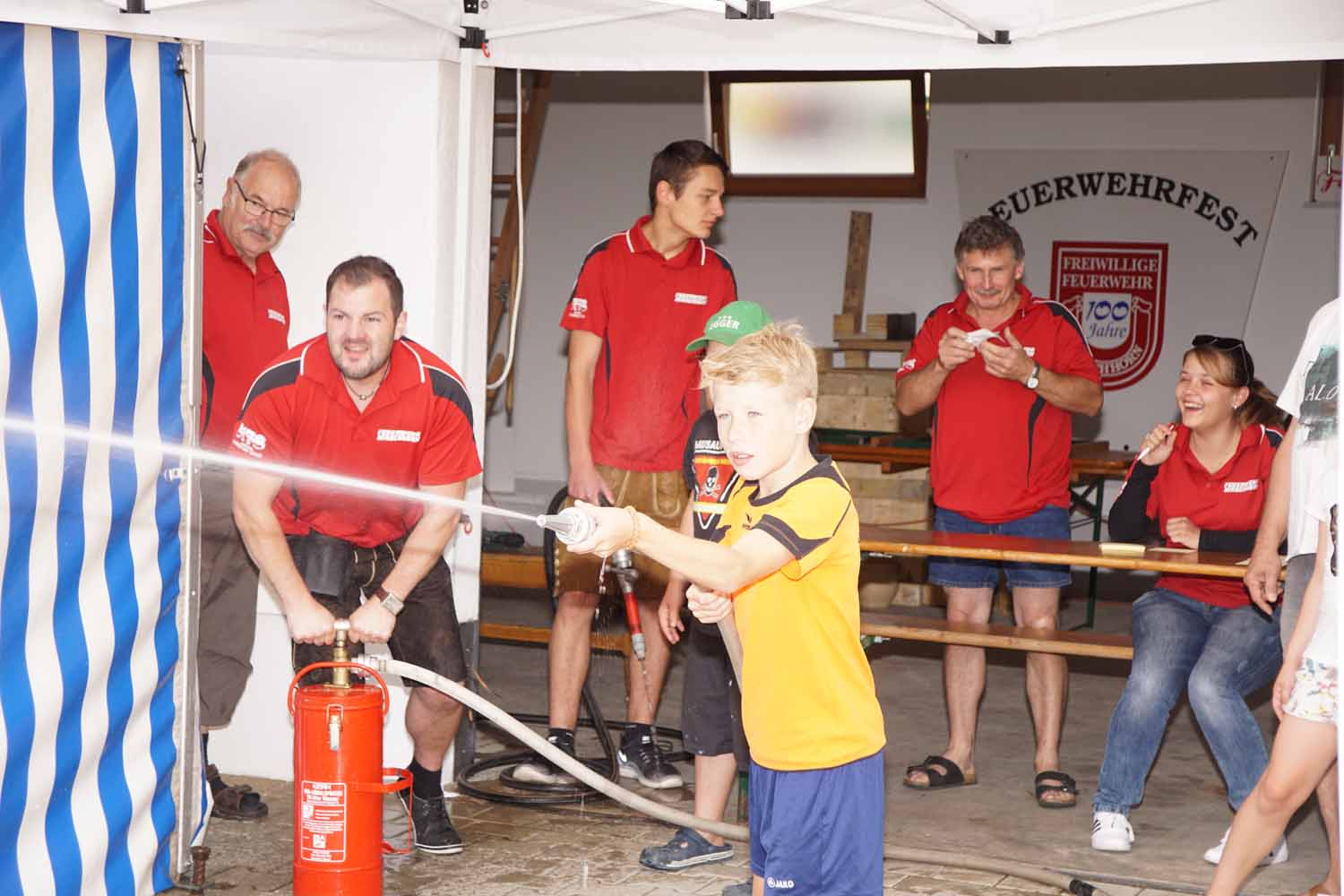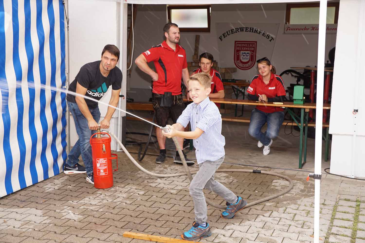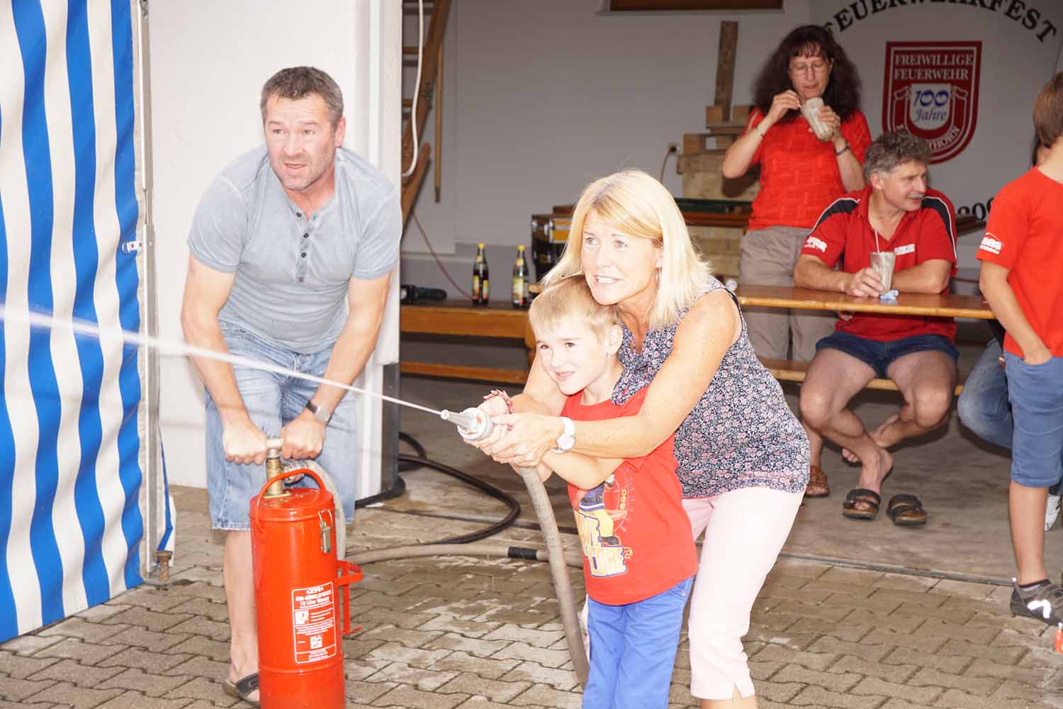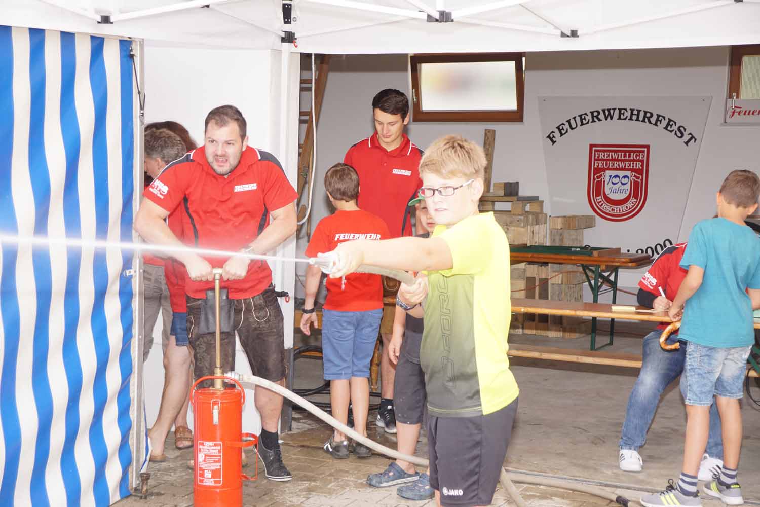 Das Highlight für die Kids war aber der von Christoph Ferschmann organisierte Kinder-Spritzenwettbewerb. Hierbei durften die Kinder mit dem Strahlrohr einen „Brand“ löschen, während die Väter kräftig an der Kübelspritze pumpen mussten. Natürlich hielt die Feuerwehr für jedes teilnehmende Kind schöne Sachpreise parat.