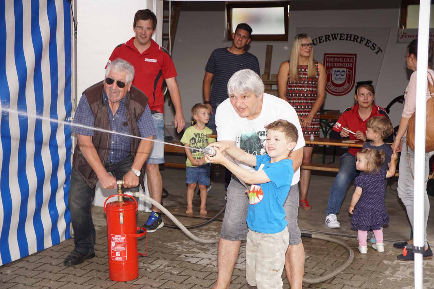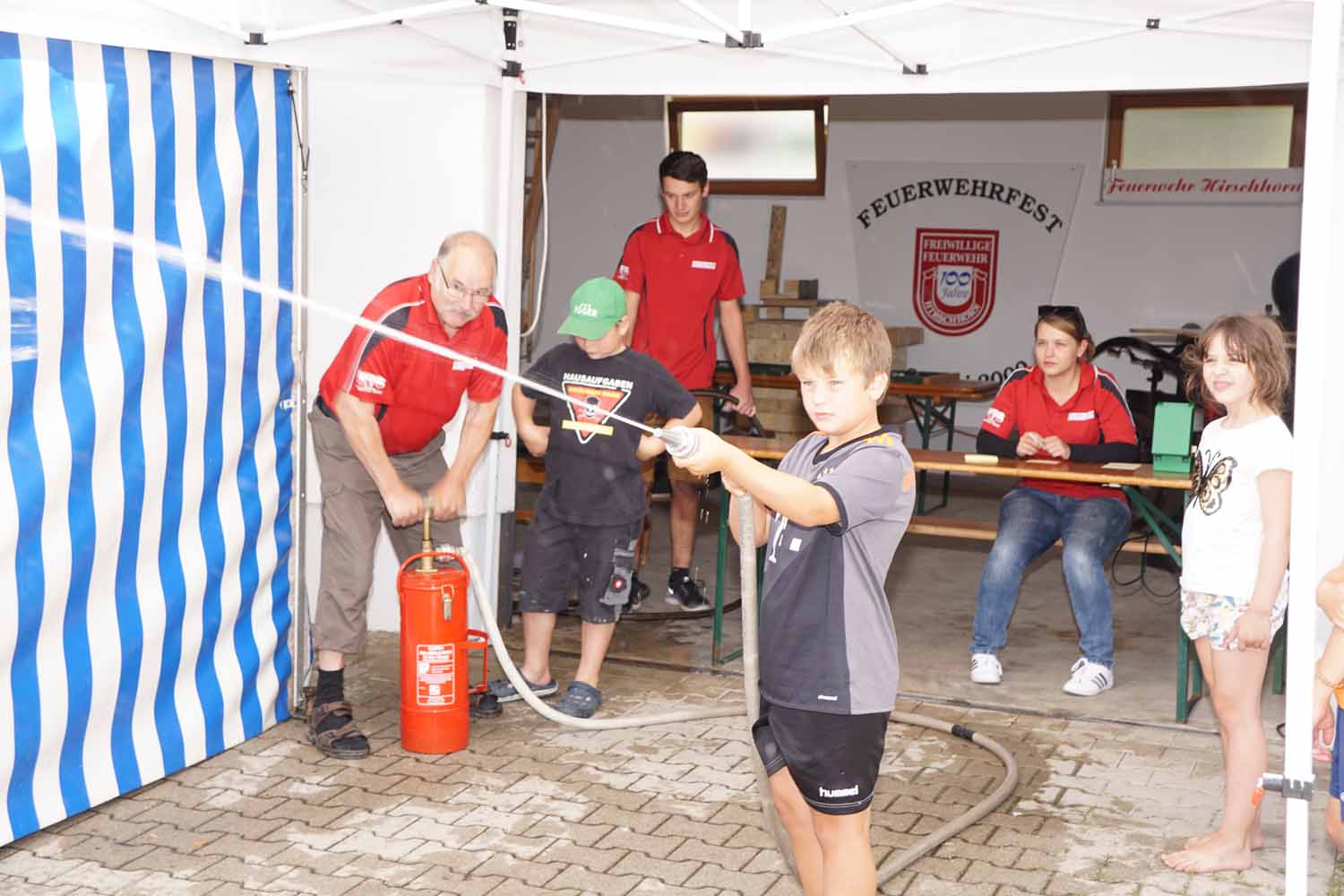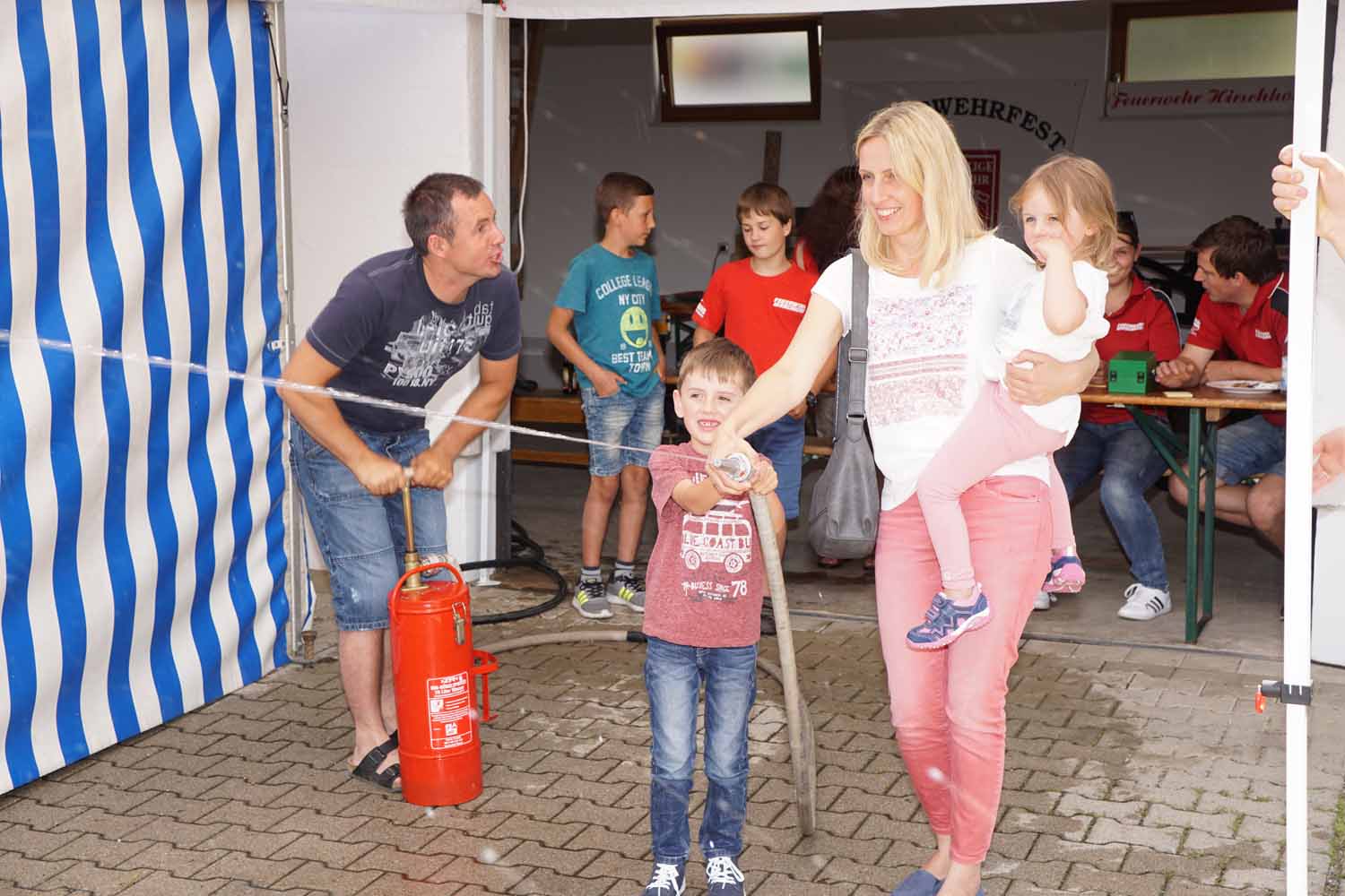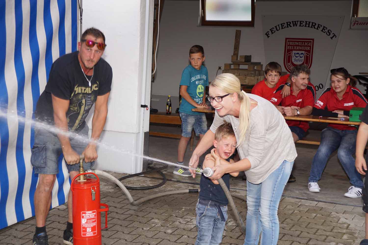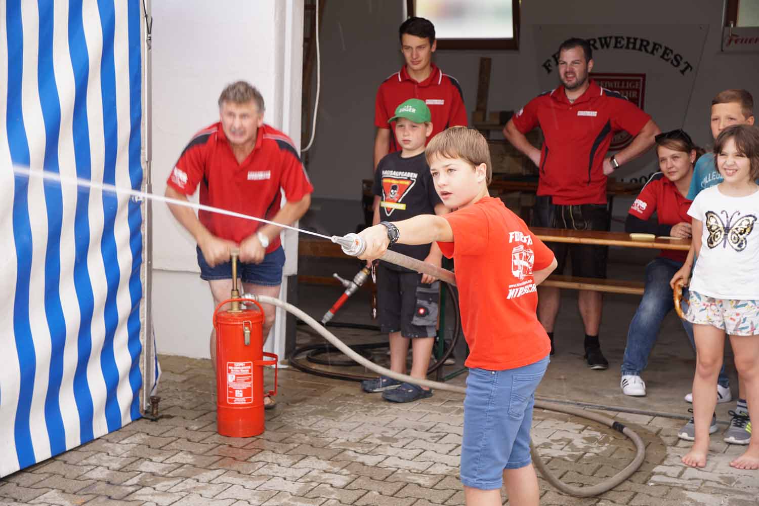 Das Highlight für die Kids war aber der von Christoph Ferschmann organisierte Kinder-Spritzenwettbewerb. Hierbei durften die Kinder mit dem Strahlrohr einen „Brand“ löschen, während die Väter kräftig an der Kübelspritze pumpen mussten. Natürlich hielt die Feuerwehr für jedes teilnehmende Kind schöne Sachpreise parat.