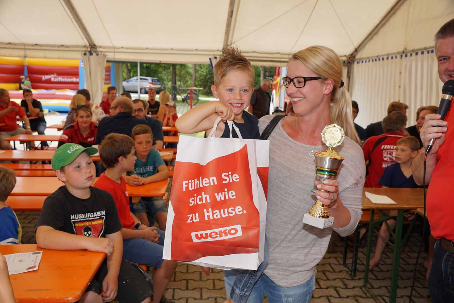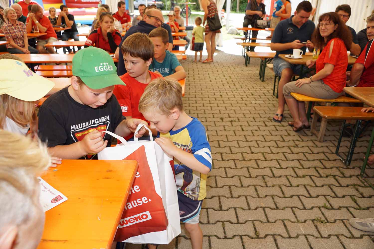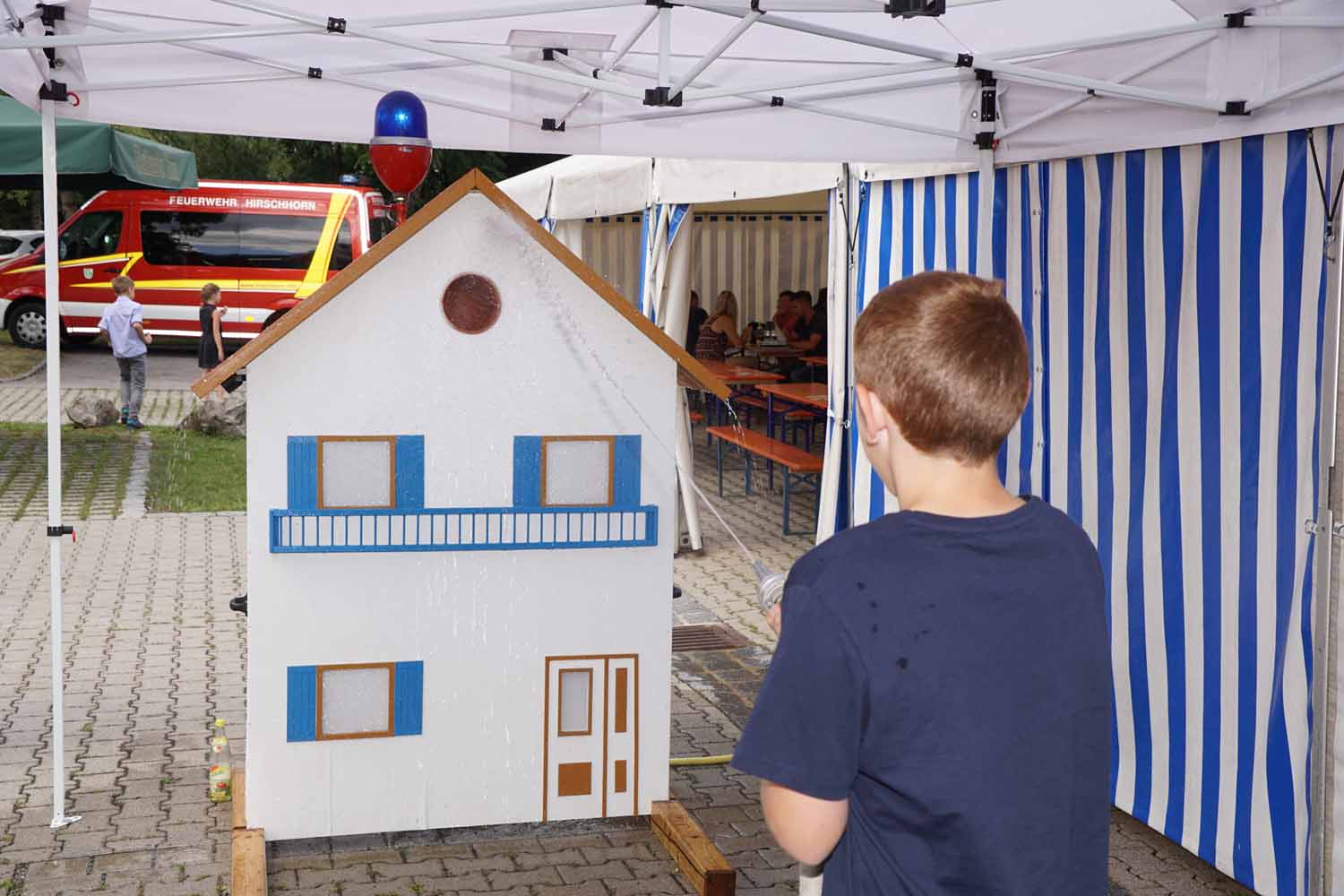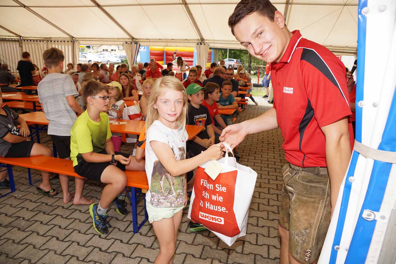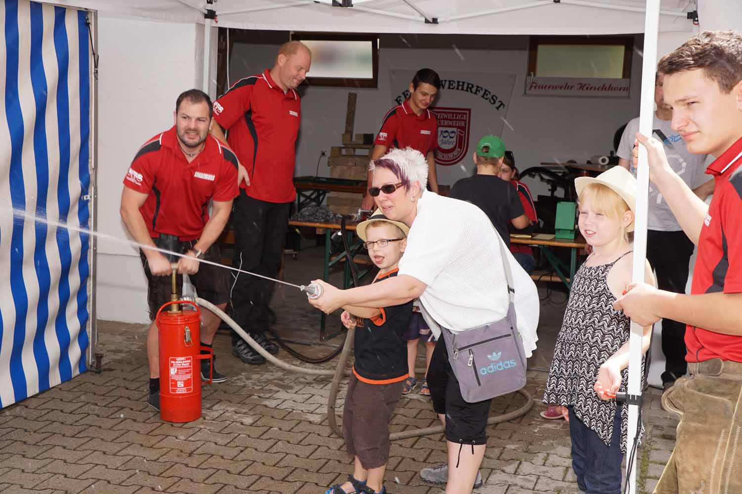 Das Highlight für die Kids war aber der von Christoph Ferschmann organisierte Kinder-Spritzenwettbewerb. Hierbei durften die Kinder mit dem Strahlrohr einen „Brand“ löschen, während die Väter kräftig an der Kübelspritze pumpen mussten. Natürlich hielt die Feuerwehr für jedes teilnehmende Kind schöne Sachpreise parat.