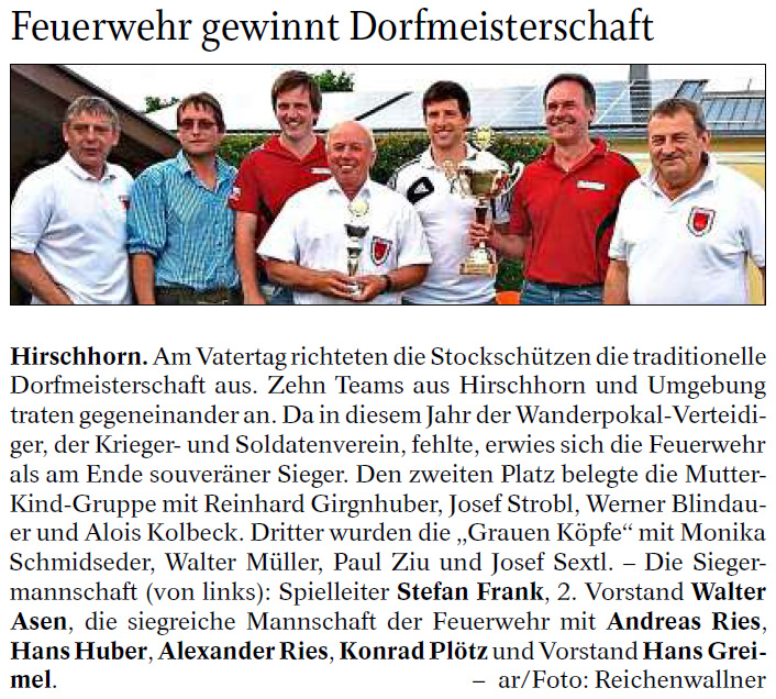 Die Stockschützen Hirschhorn richteten am Vatertag wieder ihre traditionelle Dorfmeisterschaft aus. Aus Hirschhorn und Umgebung nahmen 10 Mannschaften teil. Unsere Feuerwehr verlor kein einziges Spiel und ging somit als souveräner Sieger aus dem Turnier hervor.